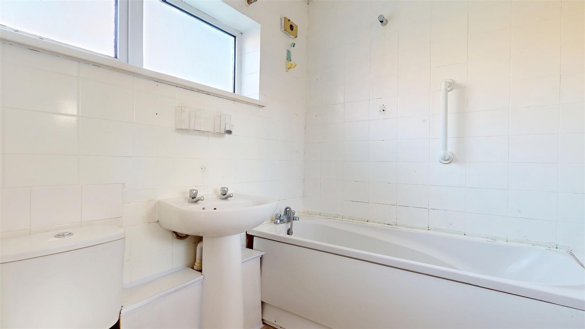 Double glazed window to front. Three piece suite comprising bath with mixer tap and shower over, wash hand basin and close coupled wc. Radiator