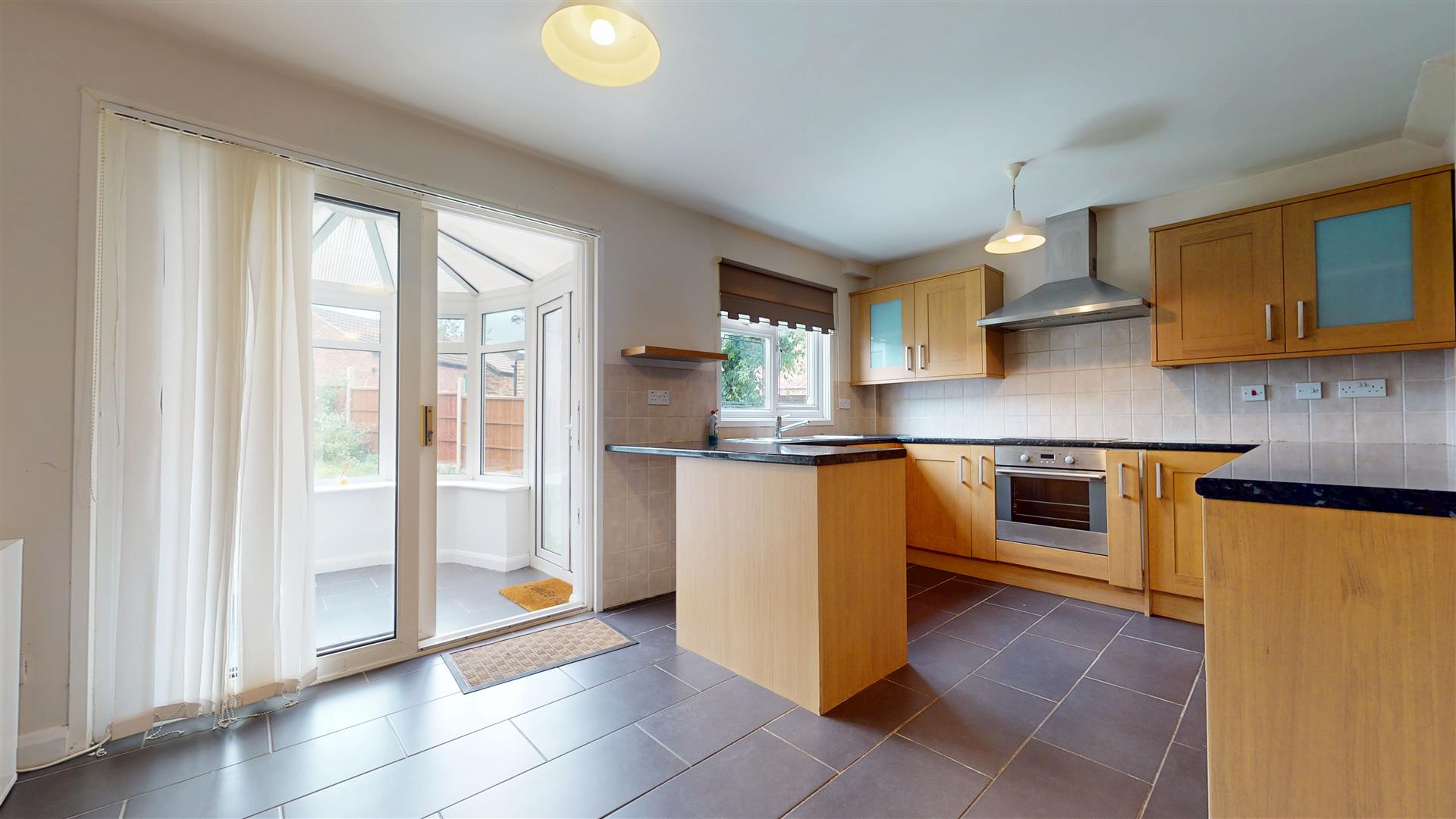 Double glazed window and patio doors to rear. Fitted wall and base units with worksurfaces with one and half bowl sink drainer unit. Electric oven and hob withy extractor hood over. Integral dishwasher. Plumbing for washing machine.