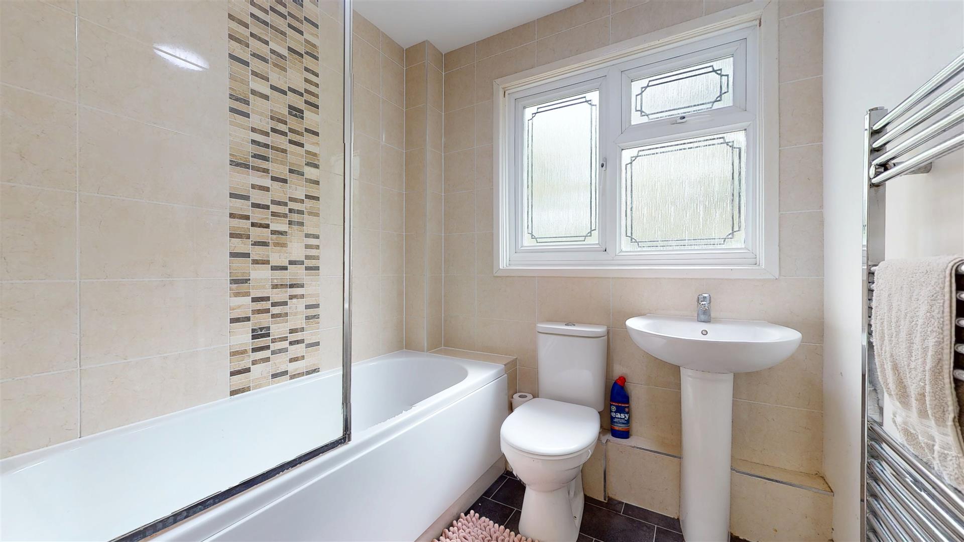 Double glazed obscure window to front. Three piece suite comprising bath with electric shower over, wash hand basin and close coupled wc. Heated towel rail.
