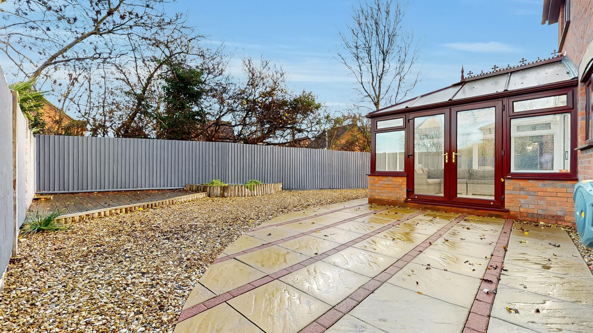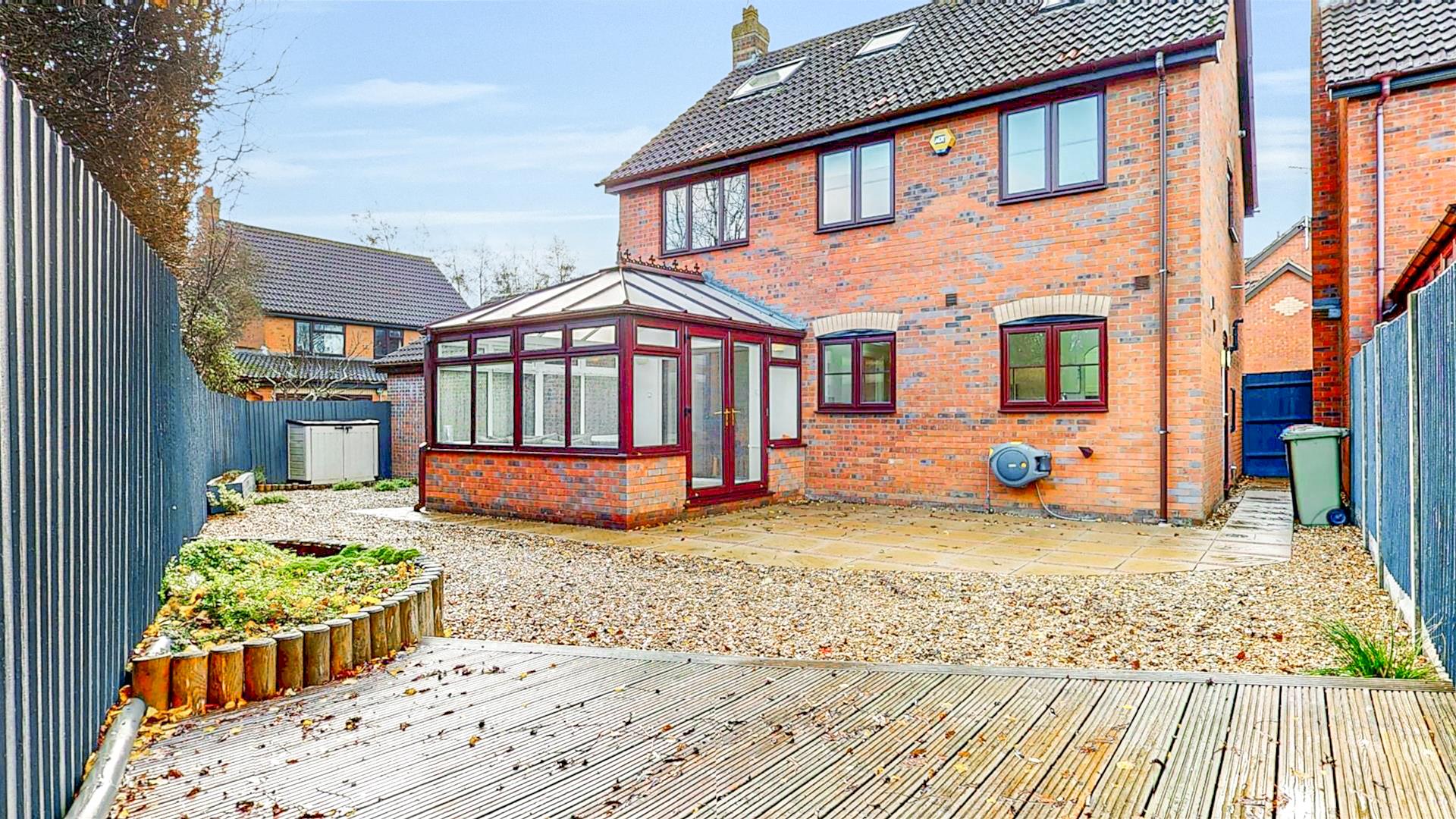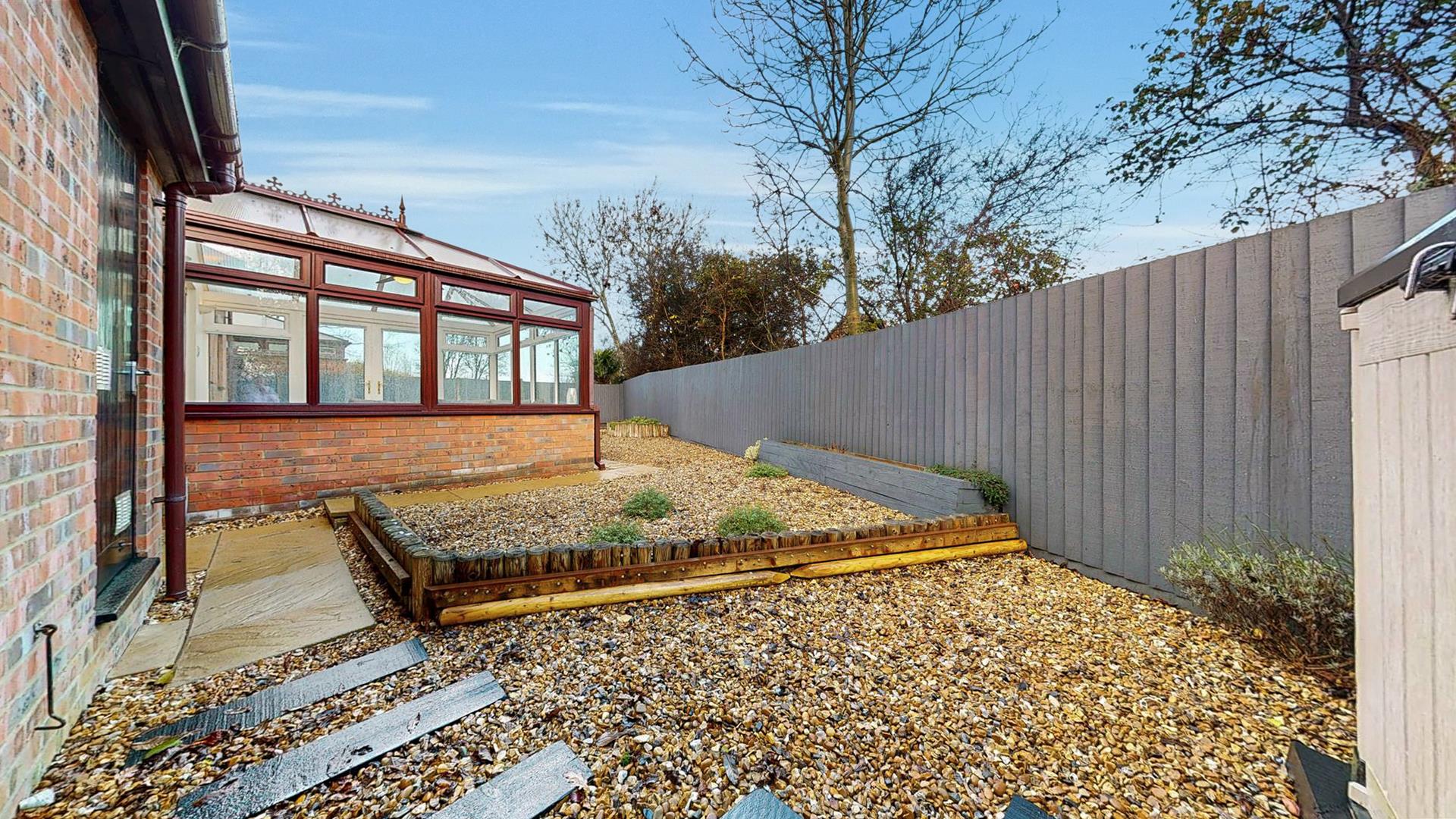Enclosed and secluded rear garden laid mainly to shingle with generous patio and decking area Wooden fence and brick wall surround. Gated side access. Door to garage. Outside tap and lighting.