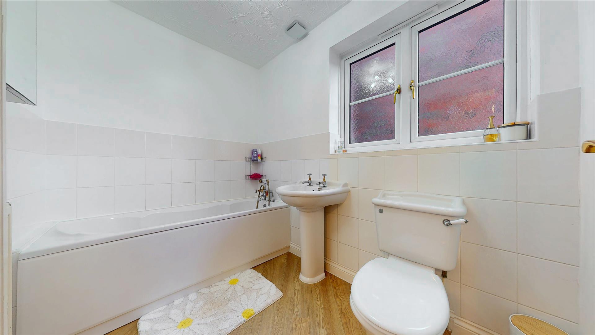 Three piece suite comprising panelled bath with telephone style shower attachment, low level wc and wash hand basin. Radiator. Part tiled walls. Frosted double glazed window to side.