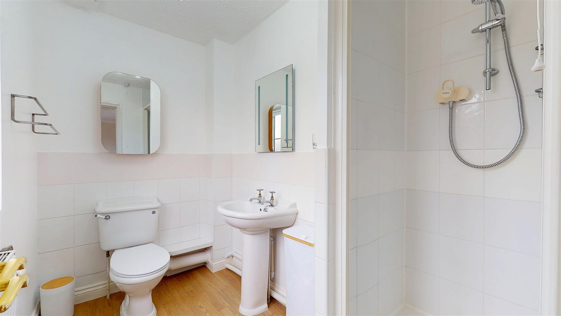 Three piece suite comprising tiled shower cubicle. low level wc and wash hand basin. Radiator. Frosted double glazed window. Part tiled walls. Extractor.