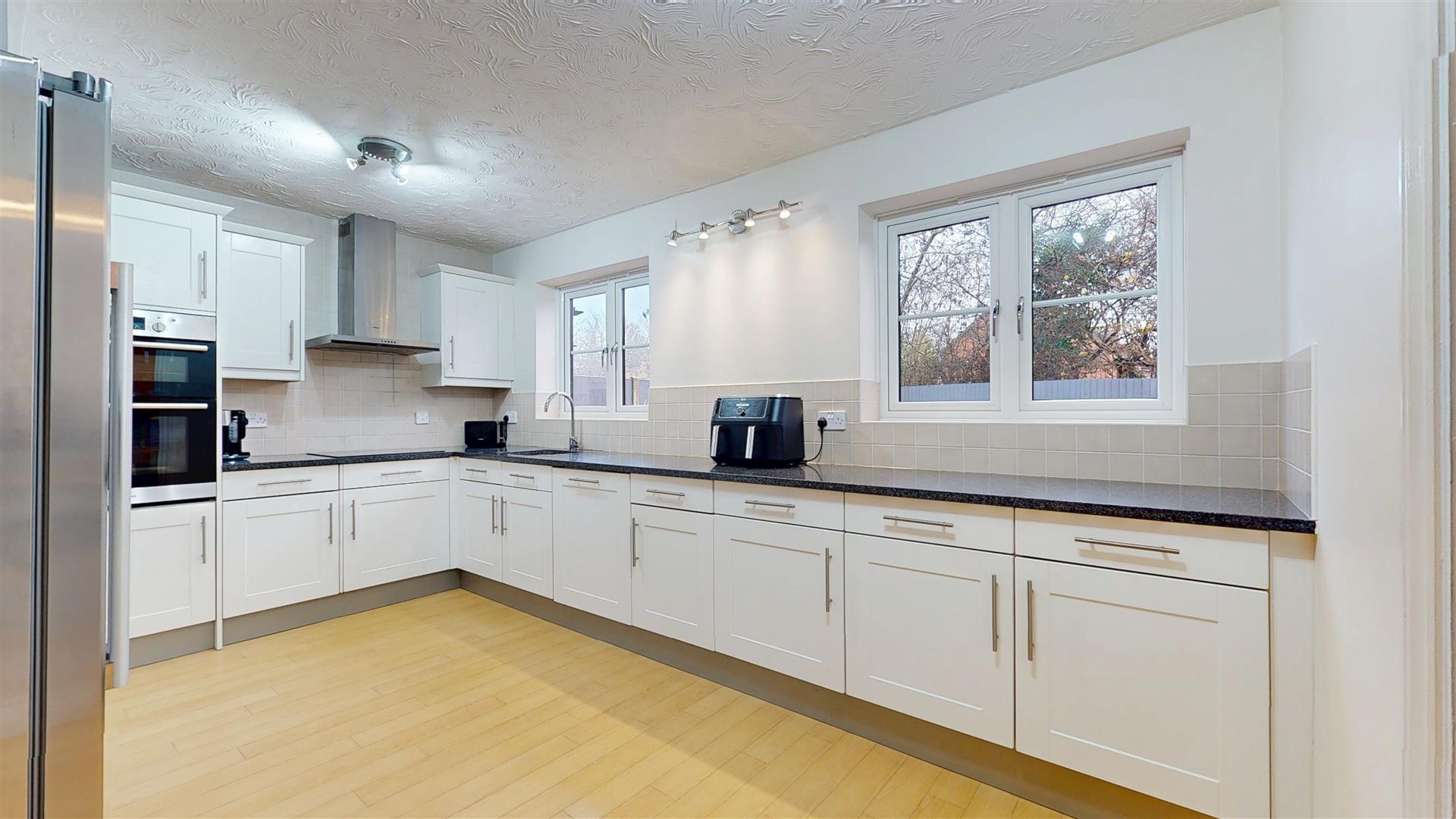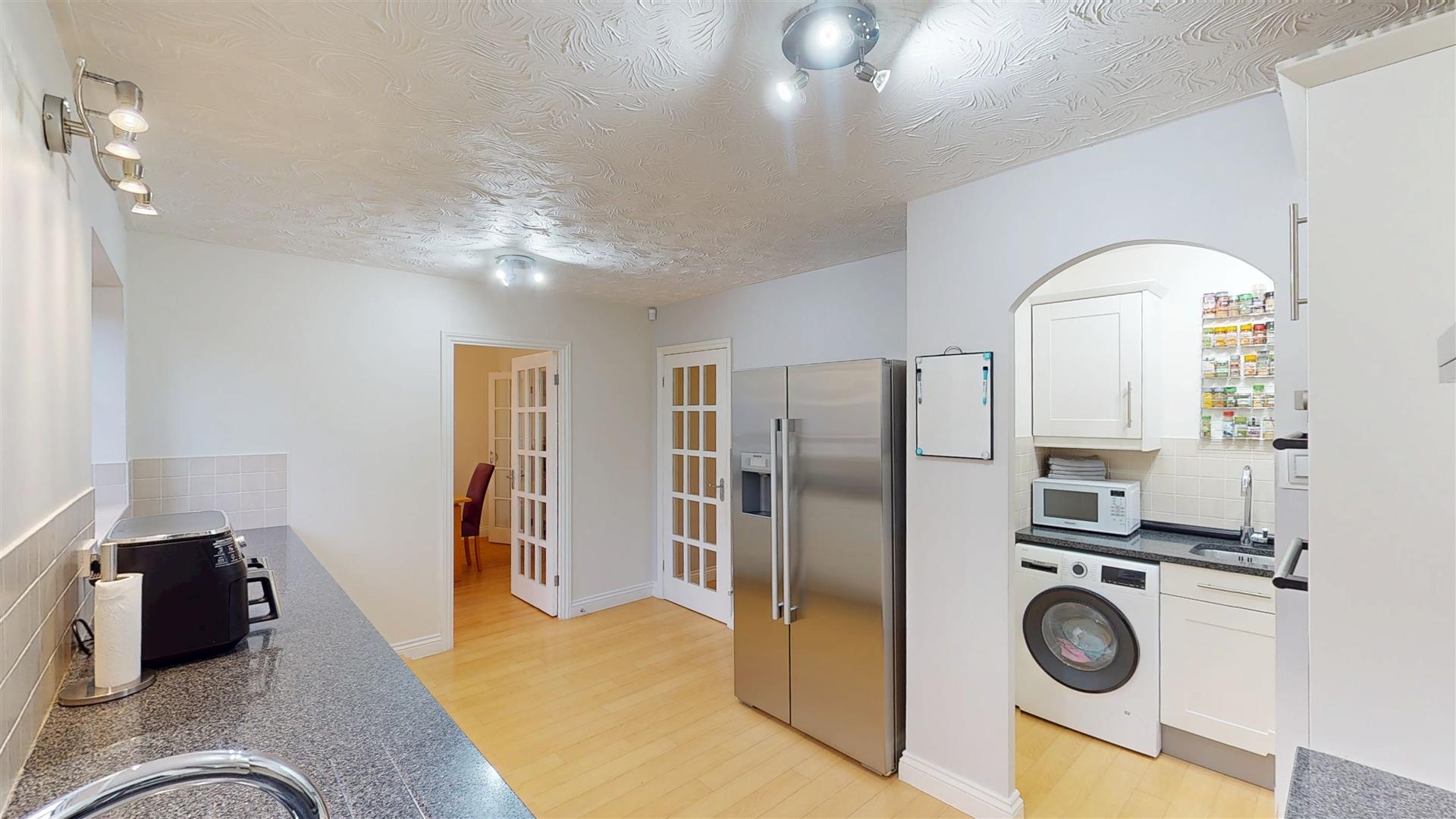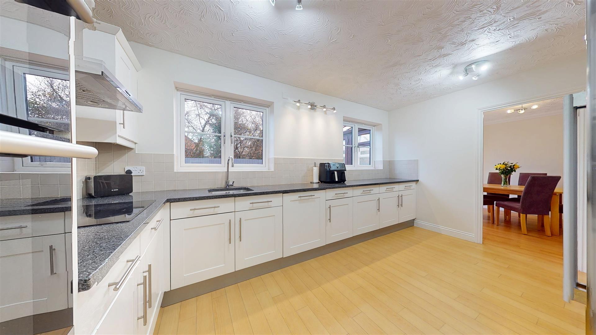 Re-fitted with a range of wall and base units with worksurfaces incorporating sink drainer and mixer tap. Built in double oven, four ring hob and extractor. Built in dishwasher. Arch to utility room. Two double glazed windows to rear. Space for American style fridge freezer. Radiator. Arch to utility room. Door to dining room.