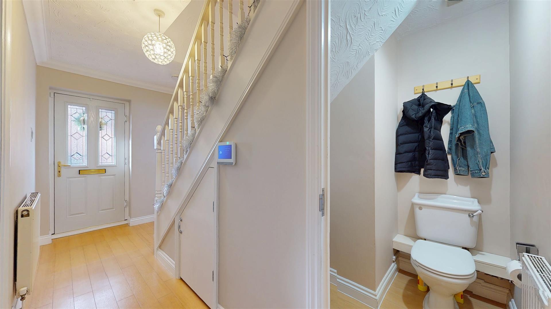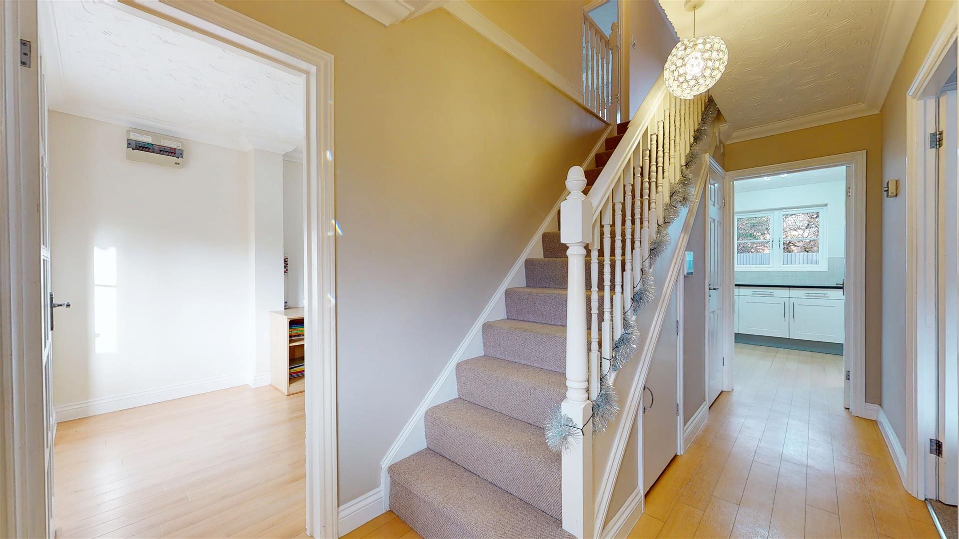 Entrance door. Stairs to first floor. Understairs storage cupboard. Radiator. Coving to textured ceiling. Door to study, living room, kitchen/breakfast room and cloakroom.