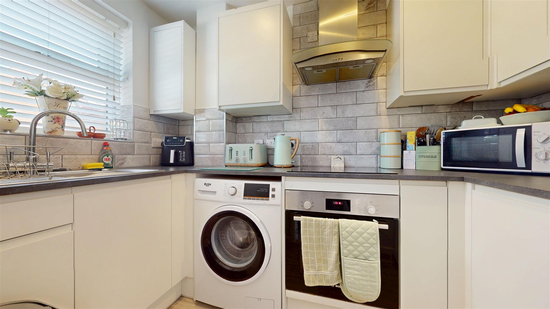 Double glazed window to front. Fitted with a modern range of wall and base units with worksurfaces incorporating stainless steel sink drainer. Electric oven, induction hob and extractor hood. Space for fridge freezer. Plumbing for washing machine. LED lighting. Tiled splash backs.
