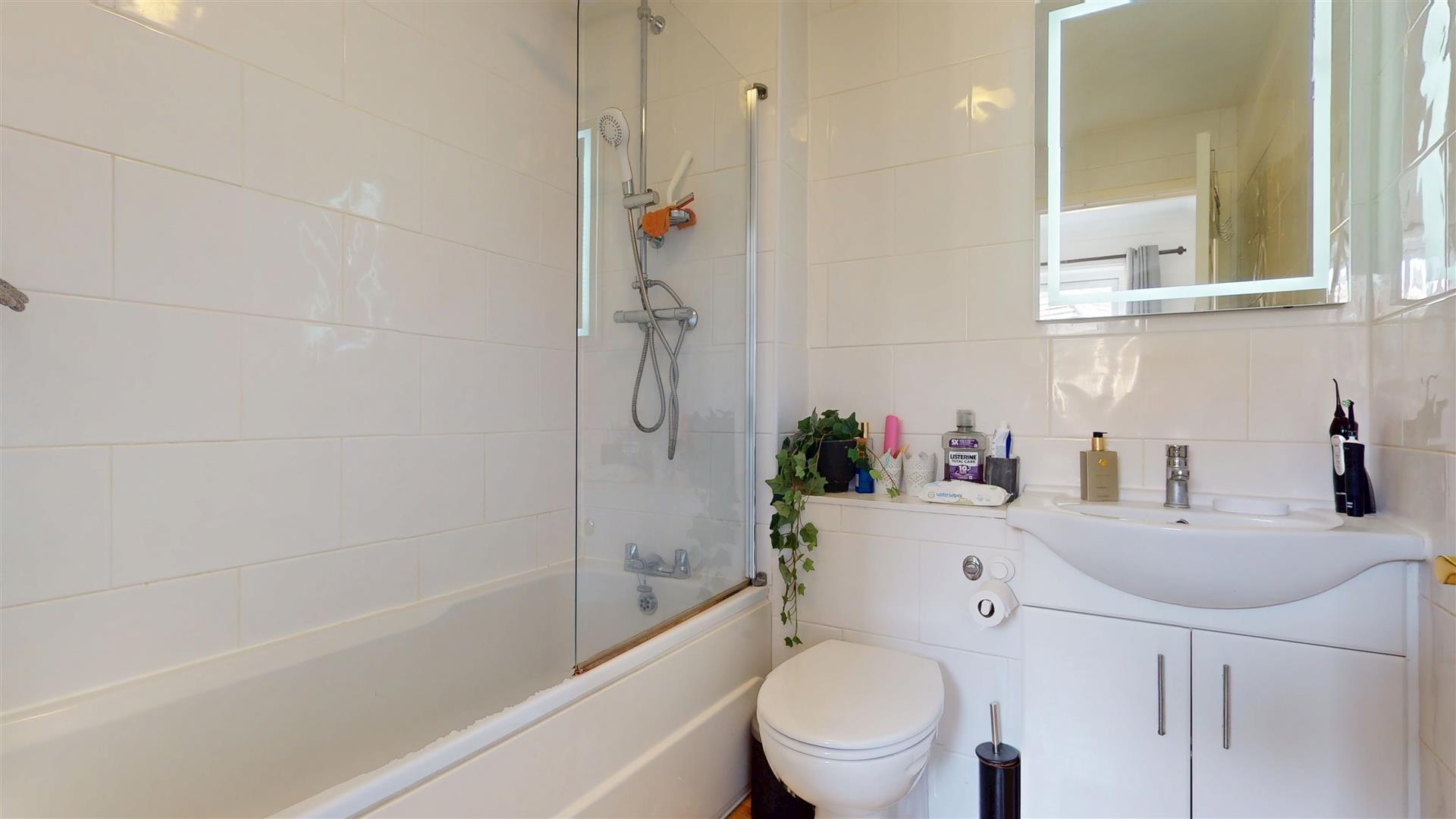 Modern three piece suite comprising bath with mains shower and screen, wash hand basin in vanity surround and close coupled wc. Heated towel rail. Tiled walls. Lit mirror. Extractor fan.