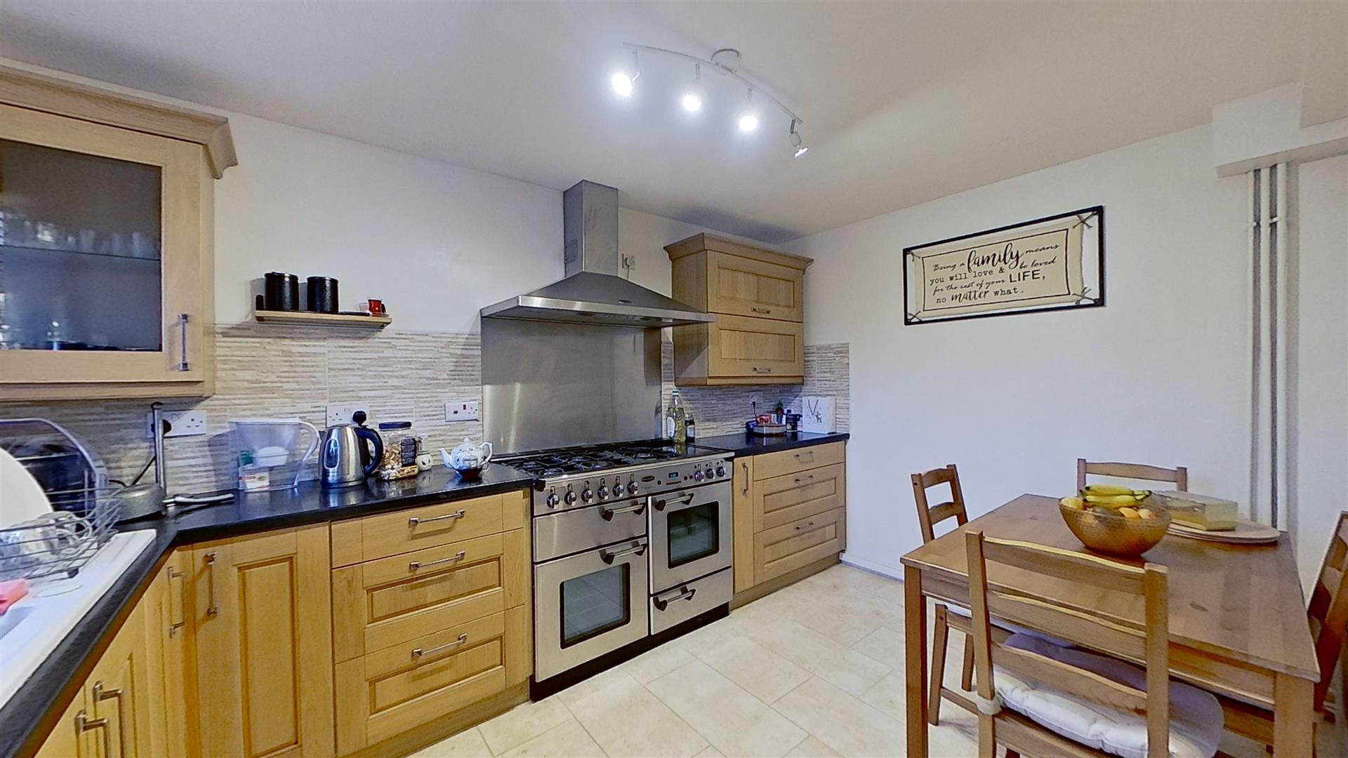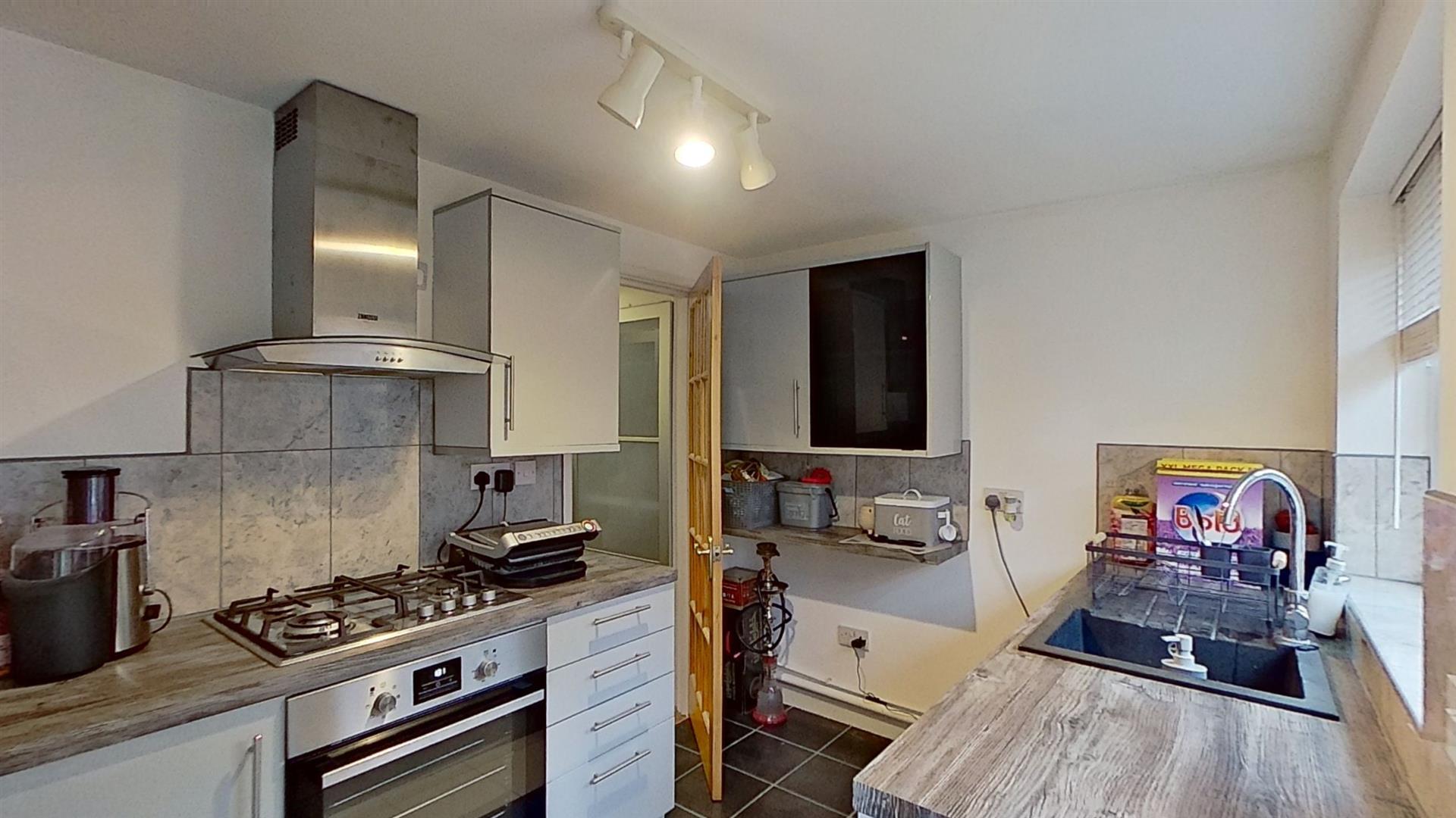 Fitted with a range of soft close wall and base units with worksurfaces incorporating a ceramic sink drainer and mixer tap. Space for Range cooker and extractor hood. Built in fridge and spice rack. Tiled flooring and splash backs. Double glazed window to front. Radiator.