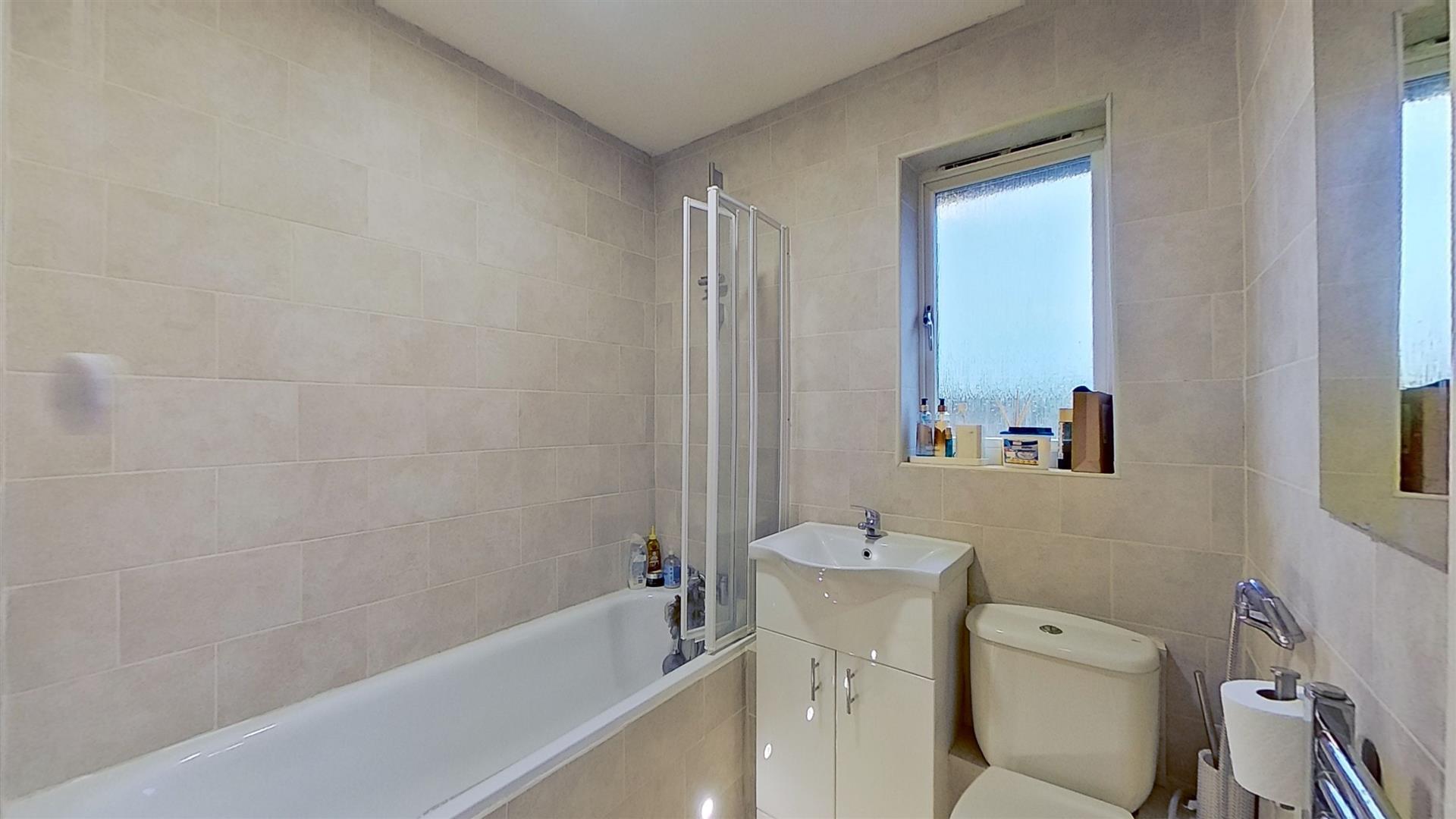 Three piece suite comprising panelled bath with shower attachment, low level wc and wash hand basin. Part tiled walls. Frosted double glazed window to front.