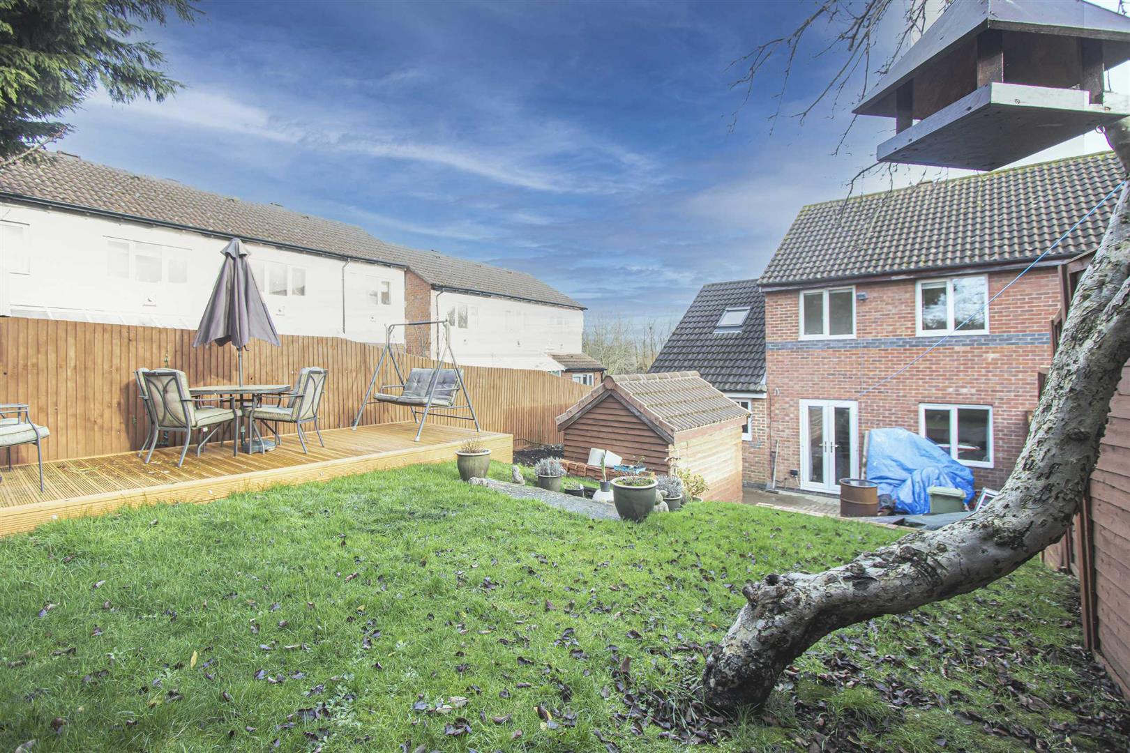 Enclosed and laid to lawn with raised garden area with wall surround. Wooden fence surround. Block paved patio area. Insultated shed. Decking area. Outside power and light.