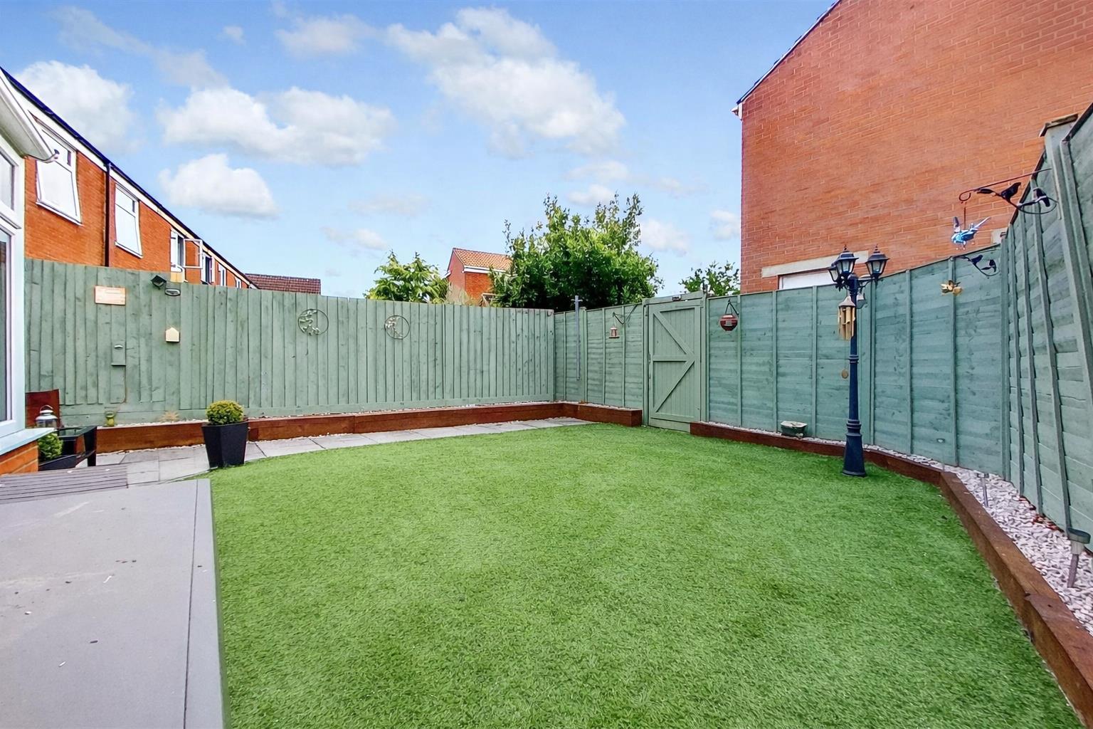 Artificial lawn, slate patio area, shingle stone beds and borders. Outside lighting. Gated access to rear.