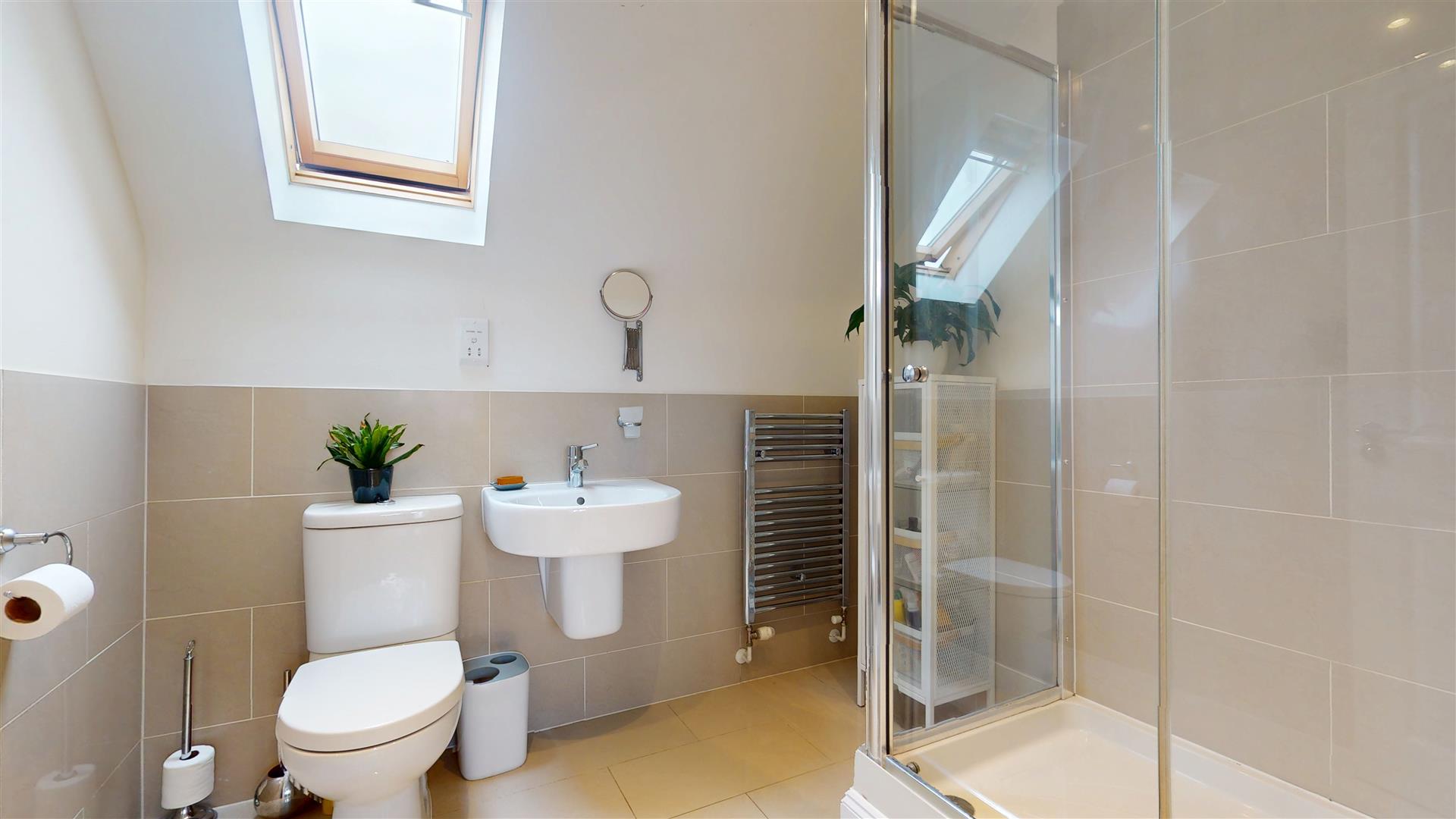 Double glazed sky light window to rear. Three piece suite comprising double shower cubicle with mains shower, wash hand basin and close coupled wc. Shaver point. Heated towel rail. LED lighting. Fitted mirror. Extractor fan. Tiled flooring Part tiled walls.