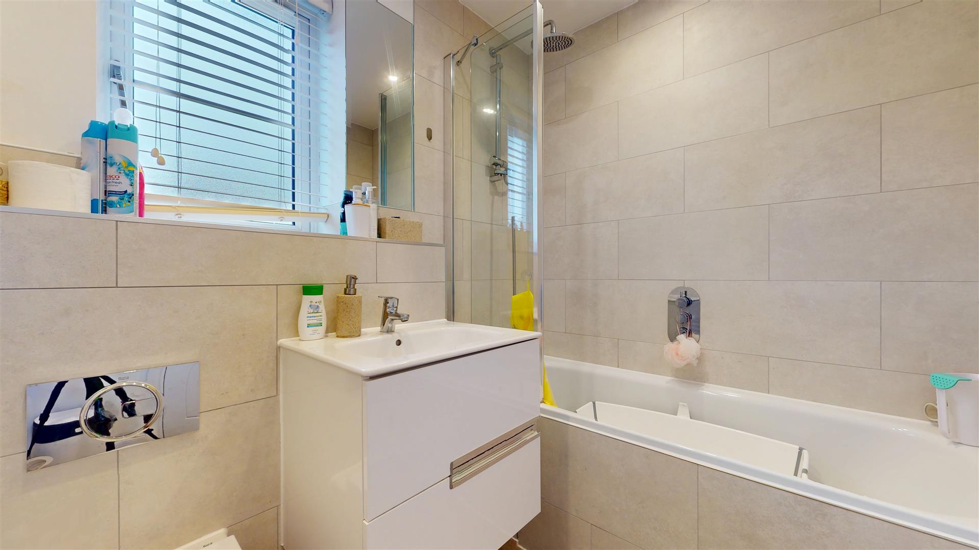 Double glazed obscure window to front. Three piece suite comprising bath with mains shower and screen, wash hand basin in vanity surround and close coupled wc. Shaver point. Mirror. Heated towel rail. Extractor fan. LED lighting. Karndean flooring.