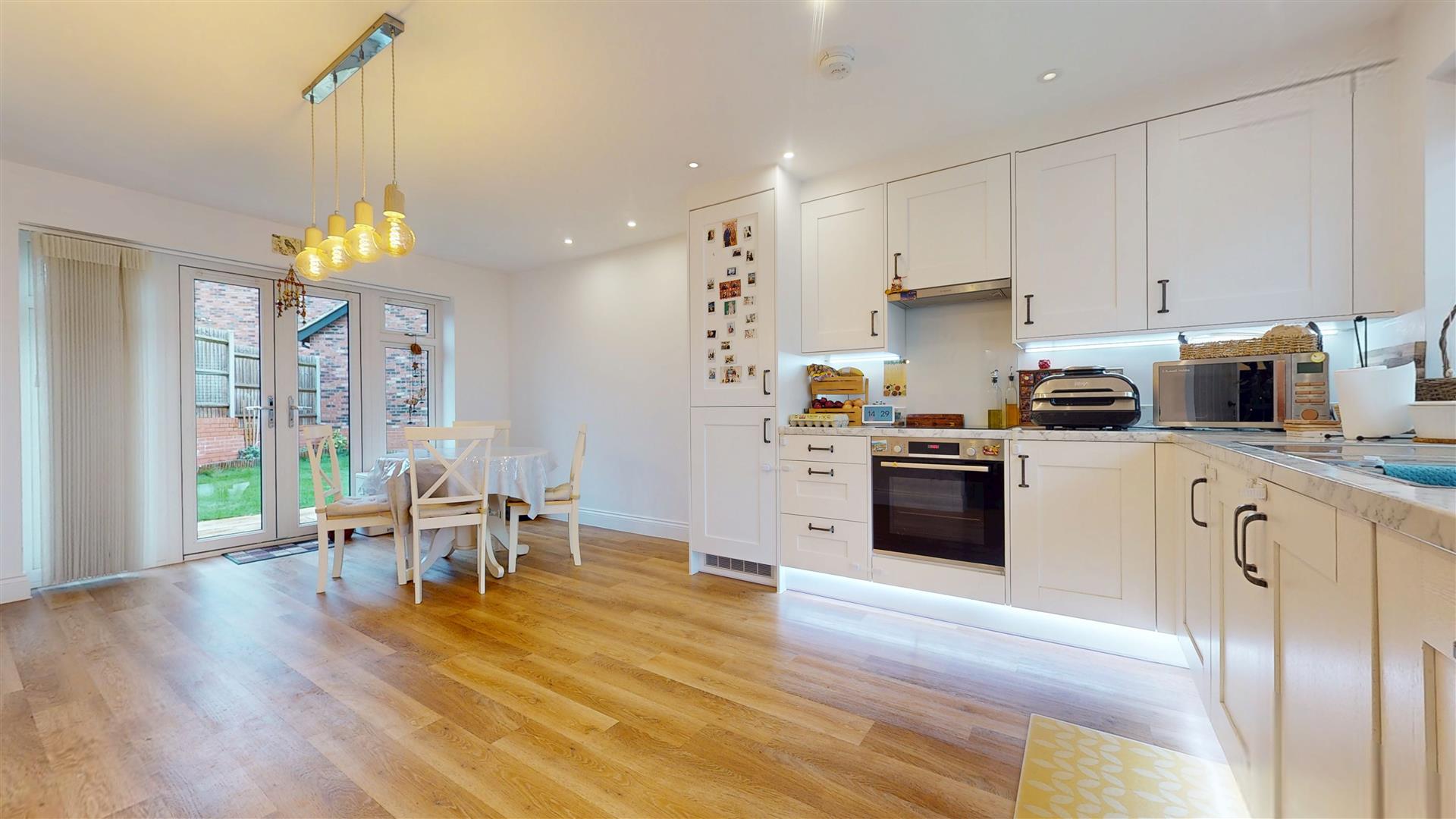 Double glazed window to front and double glazed French doors and windows to rear. Fitted with a range of wall and base units with worksurfaces. One and half bowl sink drainer with mixer tap and filter water tap. Electric oven and hob with extractor hood over. Integral fridge freezer and dishwasher. Under floor heating to Karndean flooring