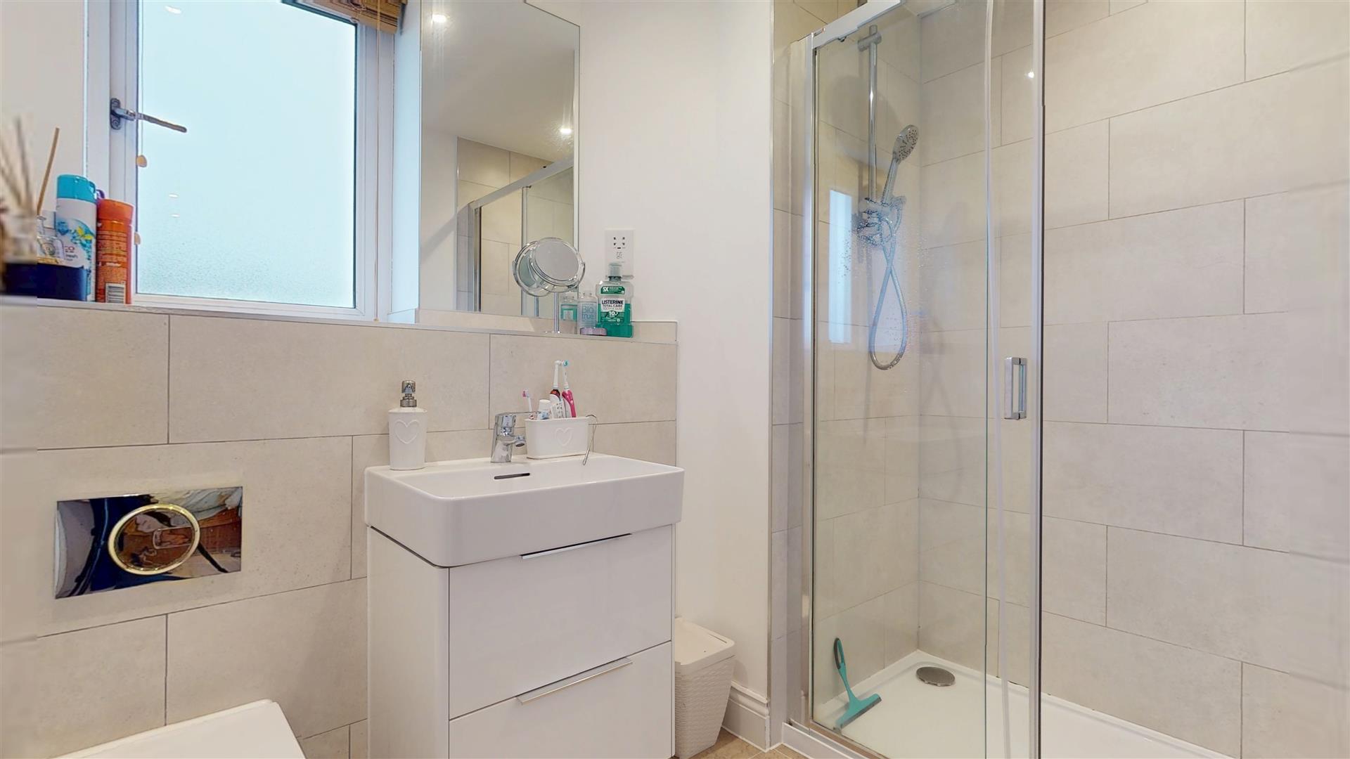 Double glazed obscure window to rear. Three piece suite comprising double shower cubicle with mains shower, wash hand basin and close coupled wc. Shaver point. LED lighting. Extractor fan. Heated towel rail. Karndean flooring.
