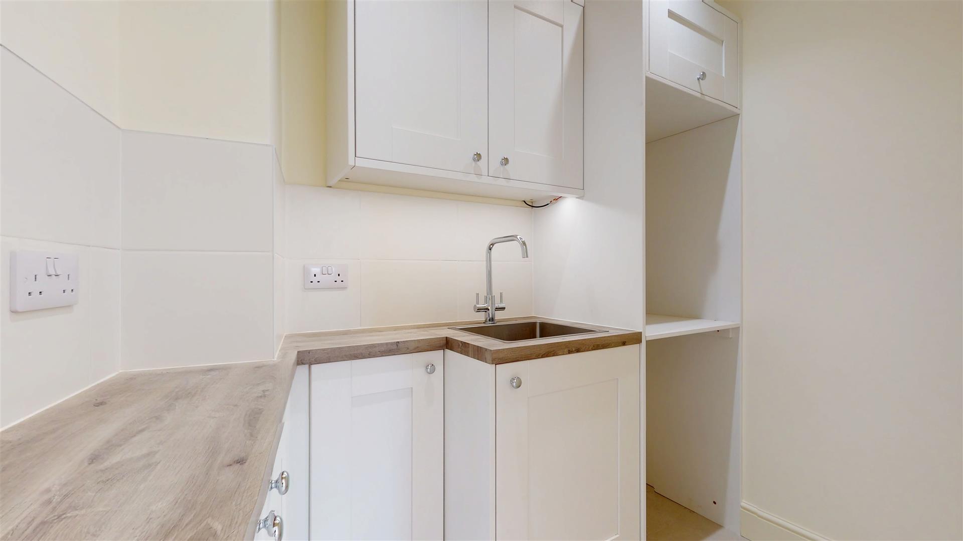 Fitted wall and base units with sink drainer. Plumbing for washing machine with space above for tumble dryer. Ceramic tiled flooring. Extractor fan. LED lighting.