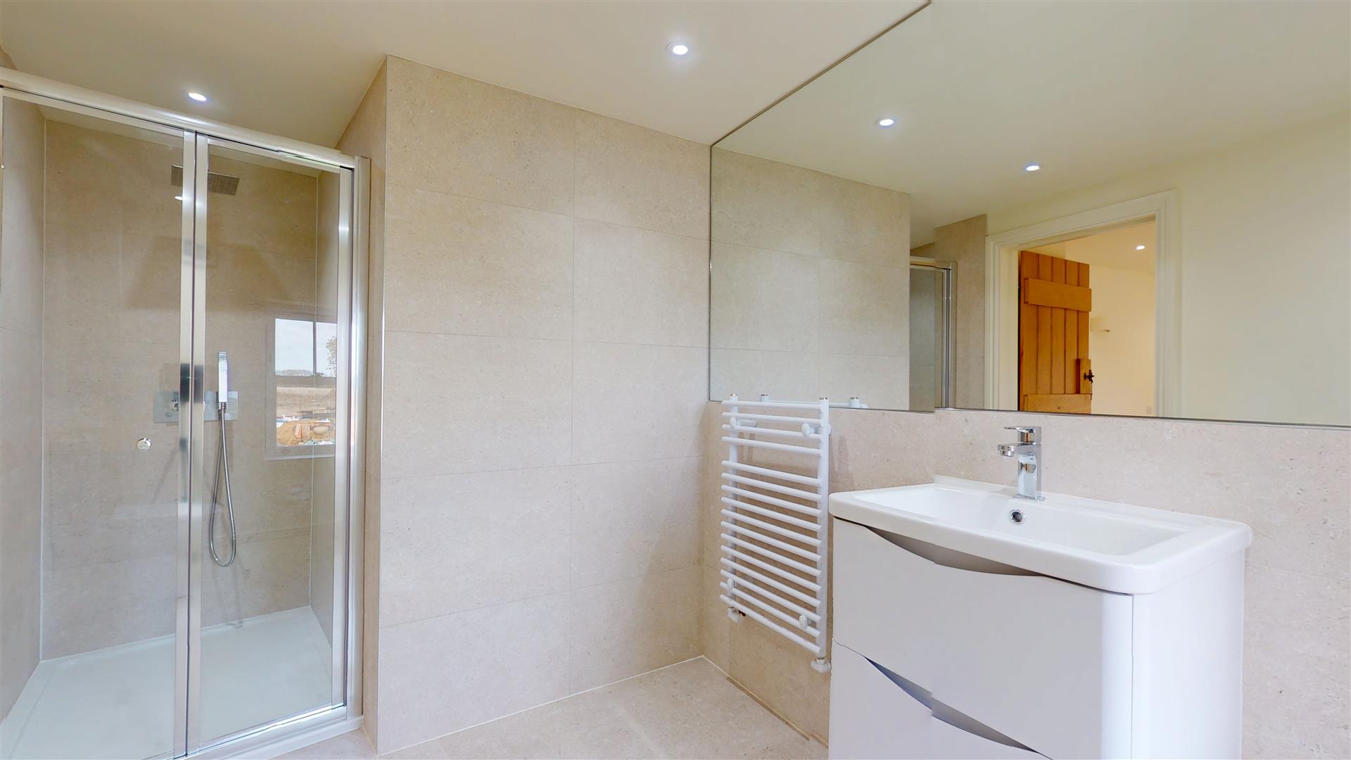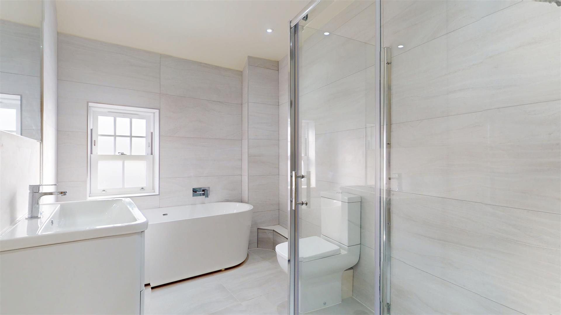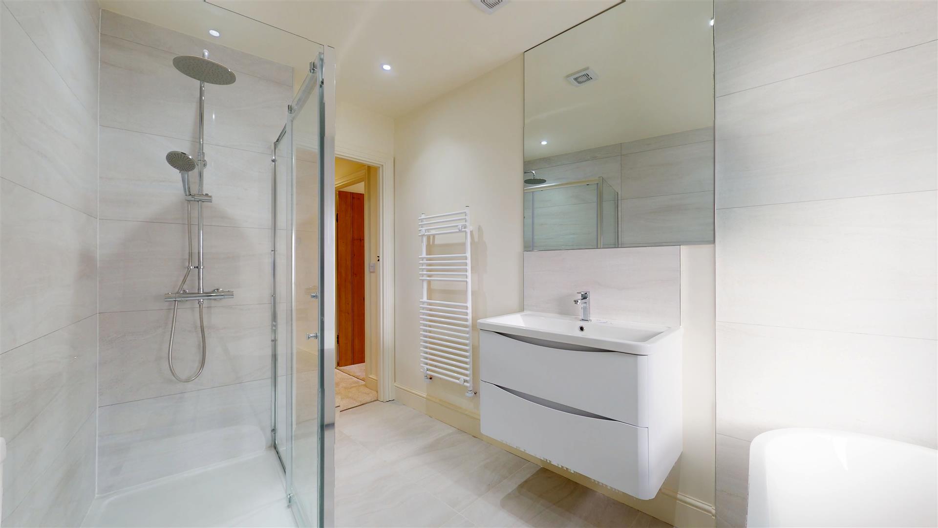 Double glazed obscure sash window to side. Three piece suite comprising freestanding bath, double shower cubicle with mains shower, wash hand basin in vanity surround and close coupled wc.. Heated towel rail. Extractor fan. LED lighting. Ceramic tiled flooring;