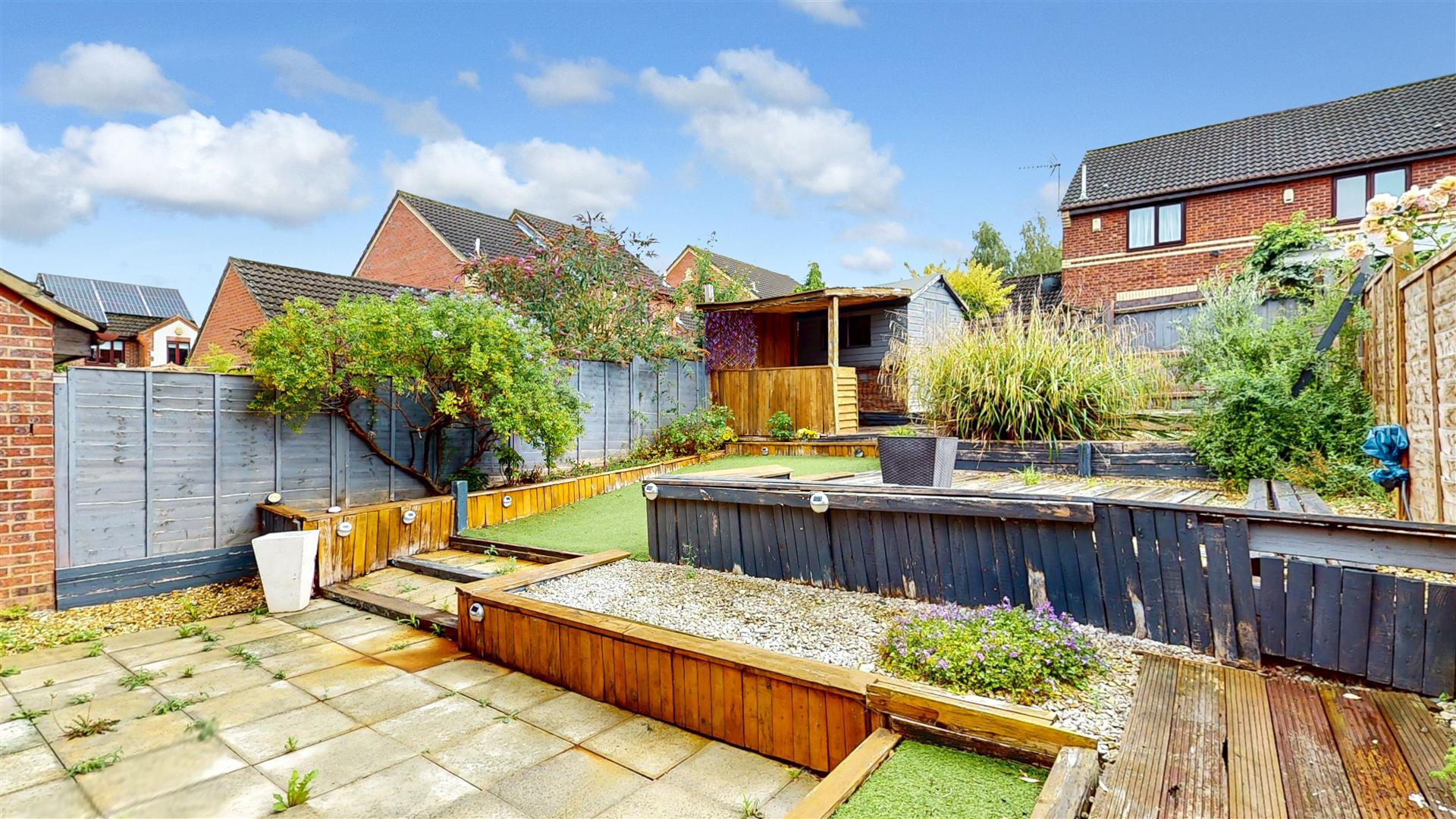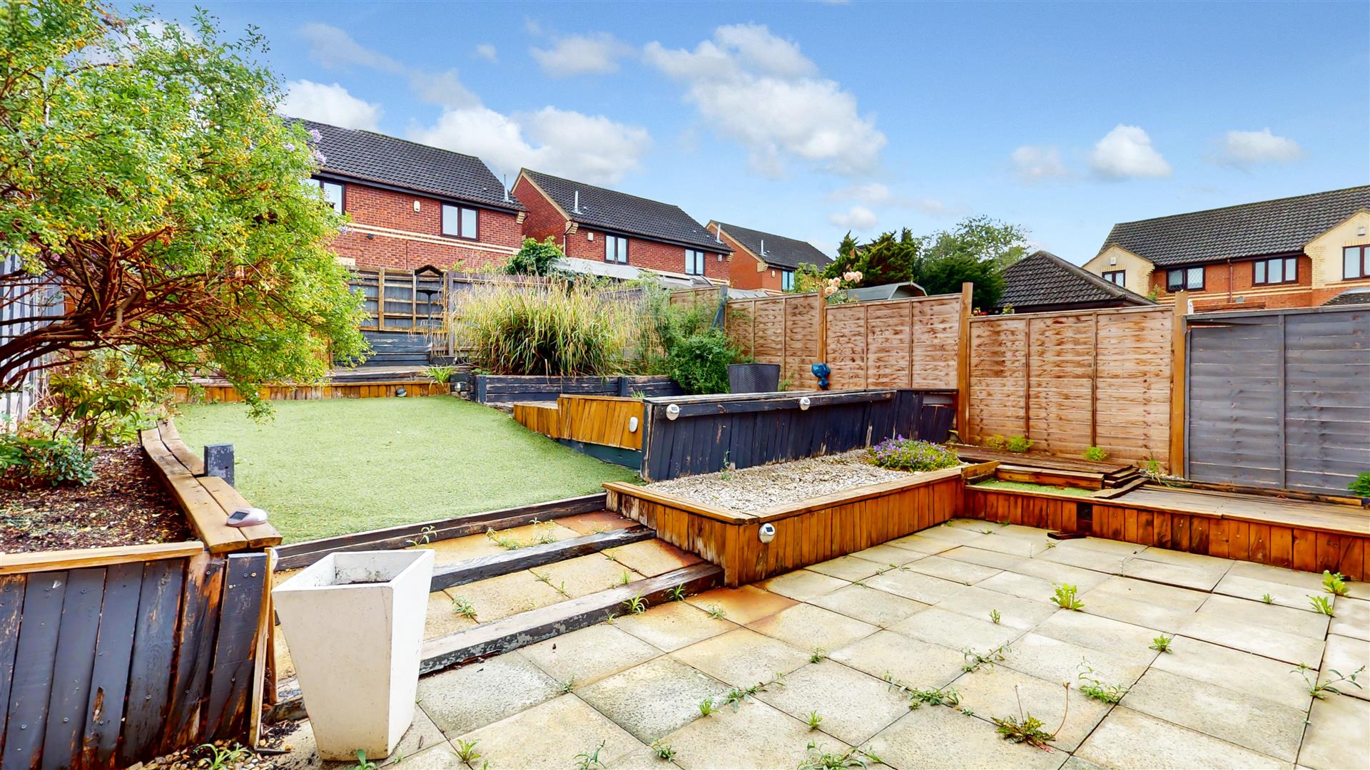 Enclosed and laid mainly to artificial lawn. Raised bedding areas. Wooden fence surround. Service door to garage.