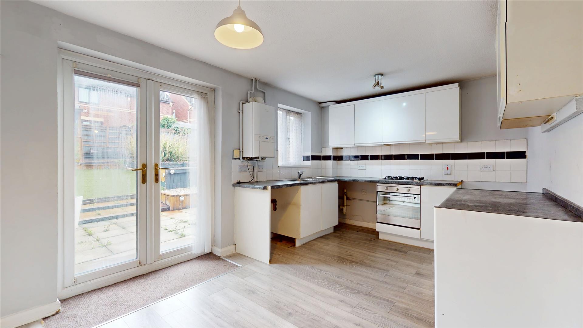 Fitted with a range of wall and base units with worksurfaces incorporating sink drainer unit. Built in oven, four ring hob and extractor hood. Plumbing for washing machine and dishwasher. Space for fridge freezer. Splash back tiling Double glazed window to rear and Double glazed French doors to rear. Wall mounted boiler. Two radiators