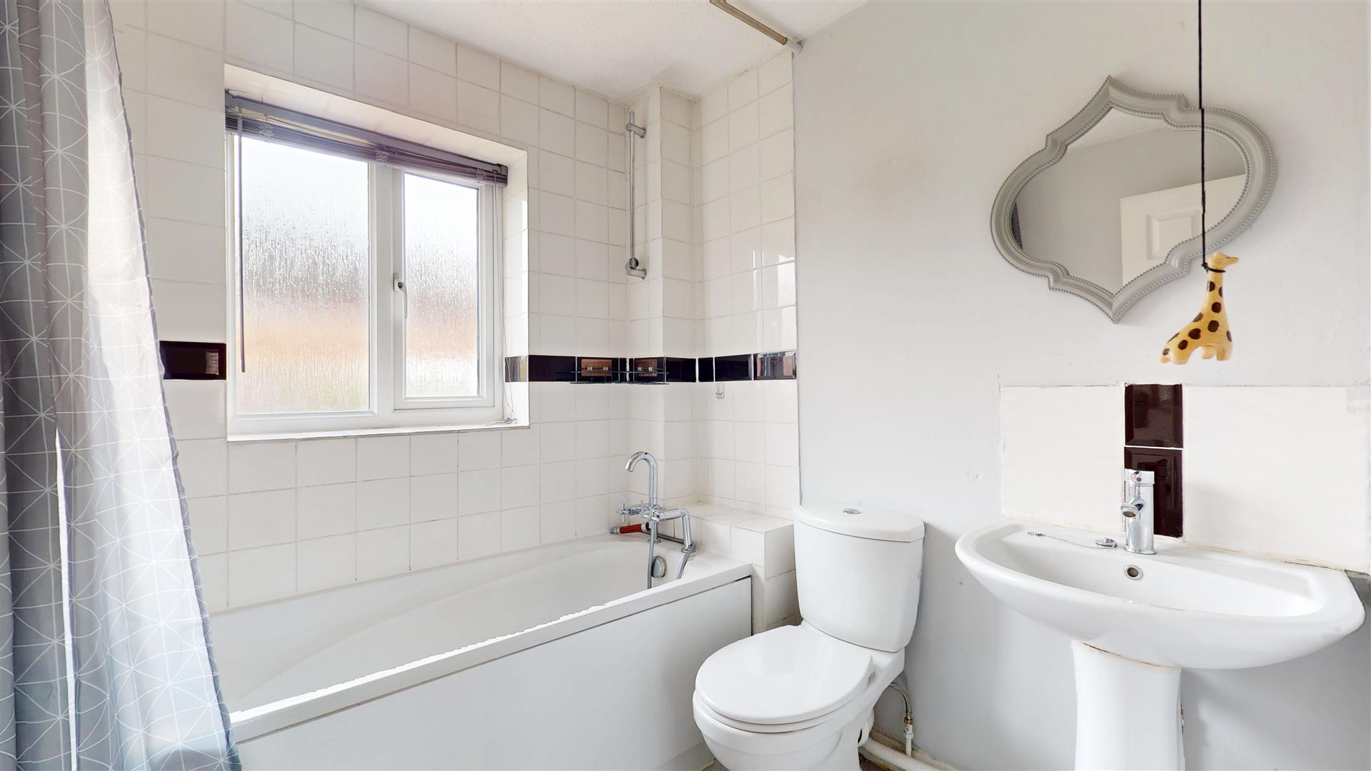 Three piece suite comprising panelled bath with shower attachment, low level wc and wash hand basin with mixer tap. Part tiled walls. Radiator. Frosted double glazed window to rear.
