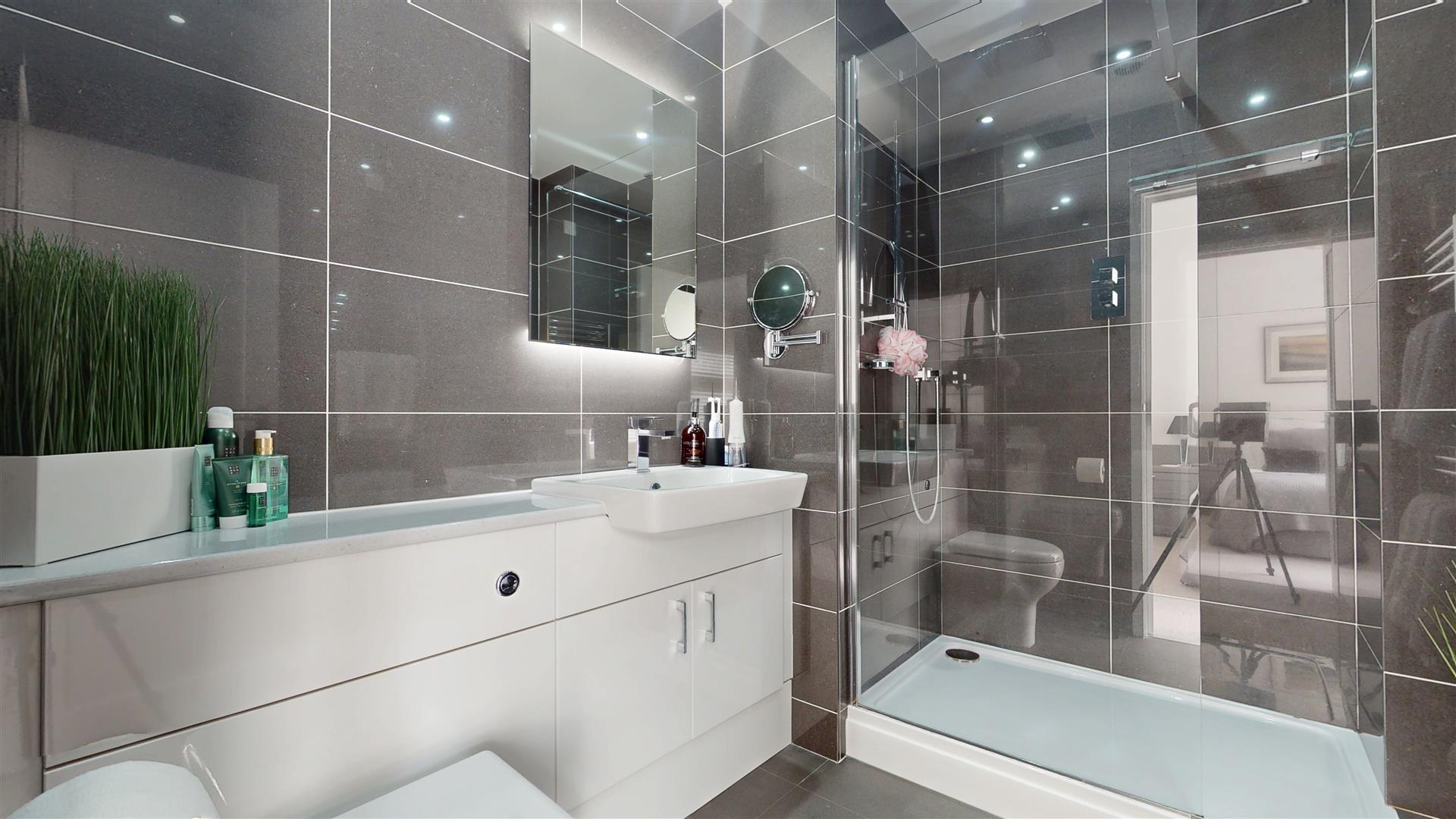 Three piece suite comprising walk in shower cubicle with shower and screen, wash hand basin in vanity surround and close coupled wc. Lit mirror. Heated towel rail. Extractor fan. LED lighting. Tiled walls and flooring.