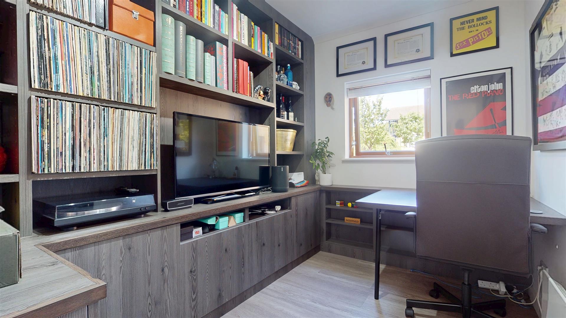 Double glazed window to side with fitted blinds. Currently used for office space with fitted shelving, desk and office furniture. Electric heater.