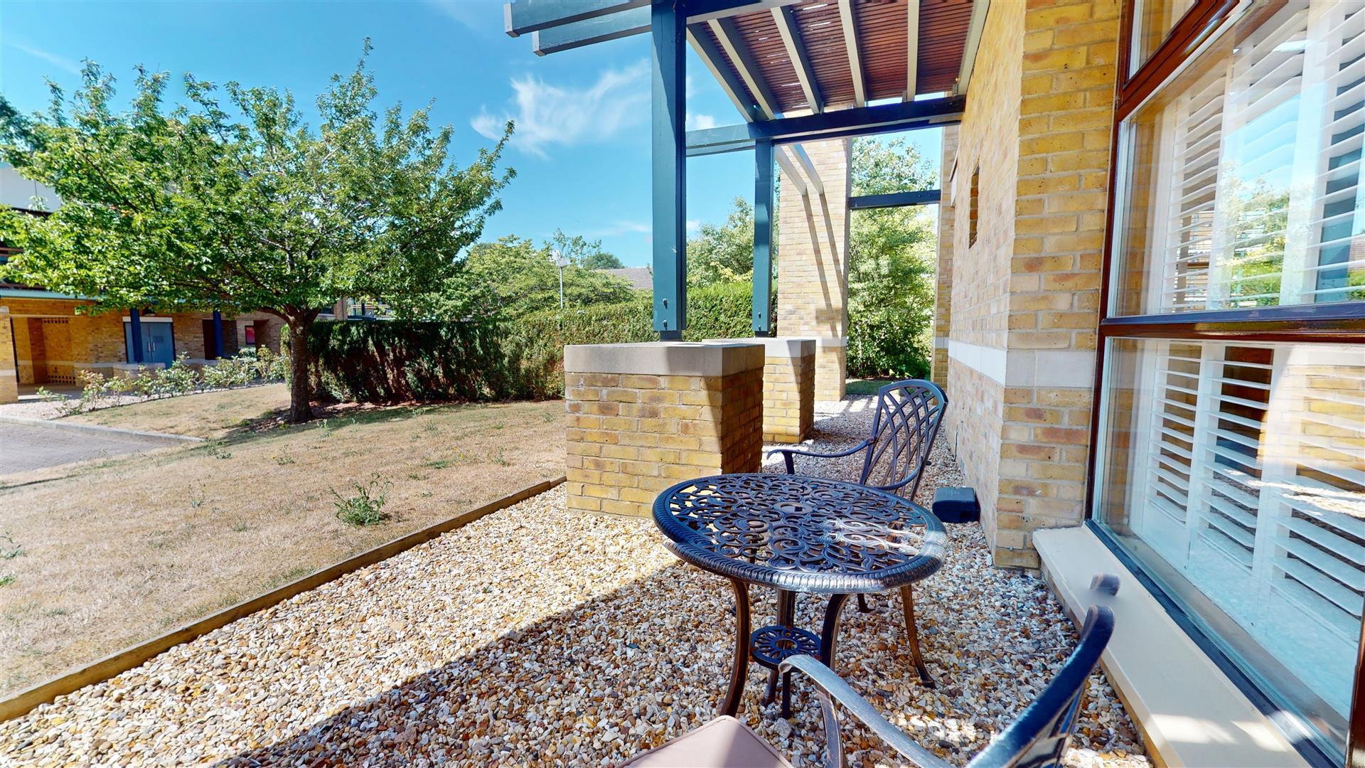 Paved seating area to side of property leading onto communal gardens with shingle stone seating area to rear