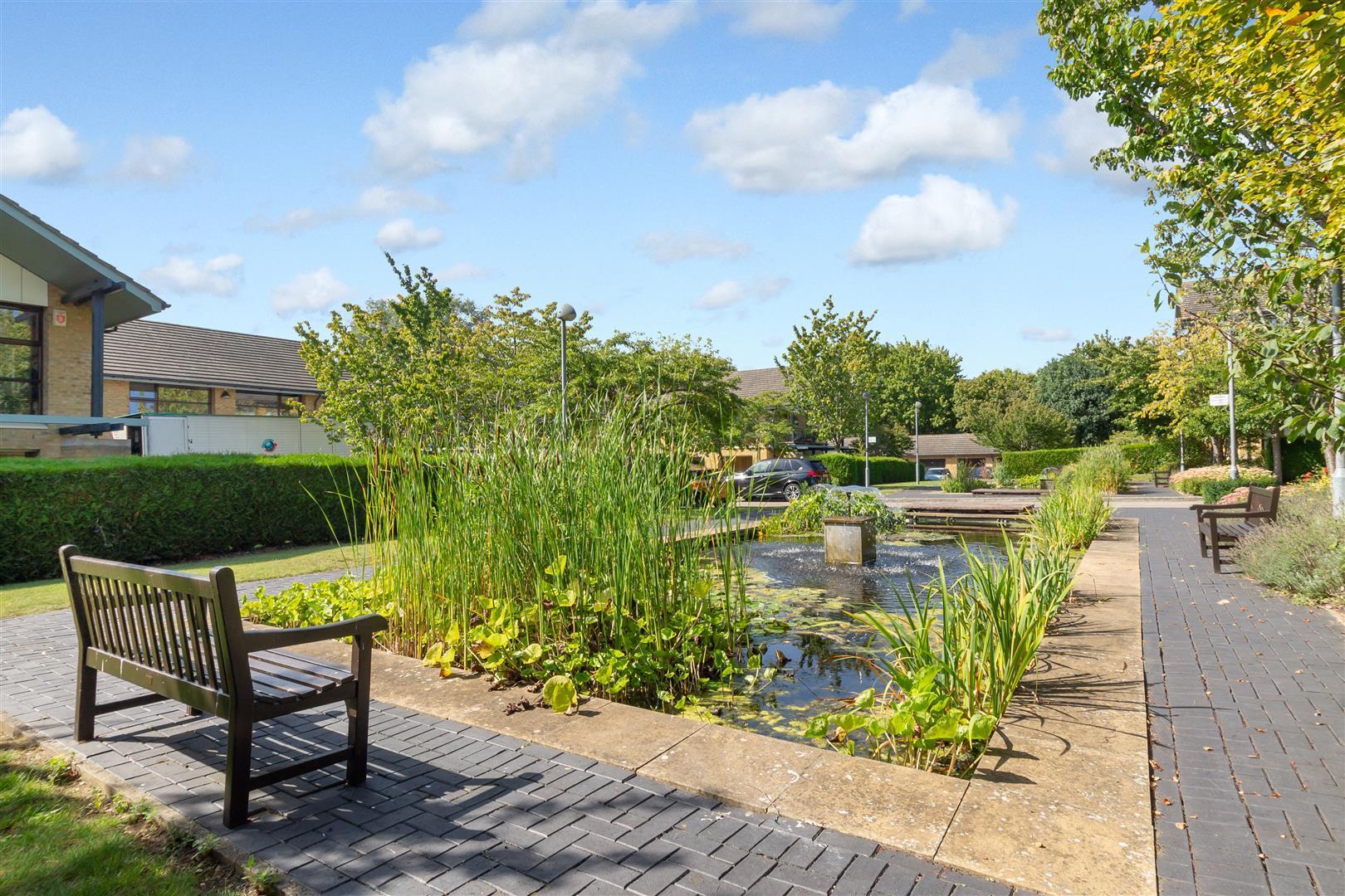 Communal gardens with mature flower beds and lawn area. Large fish pond.
