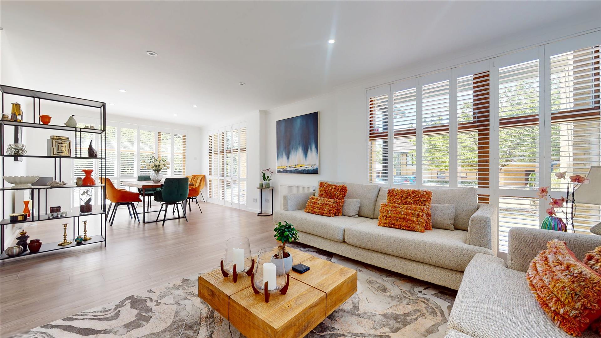 - 8 meter triple aspect living & dining room with fitted shutters