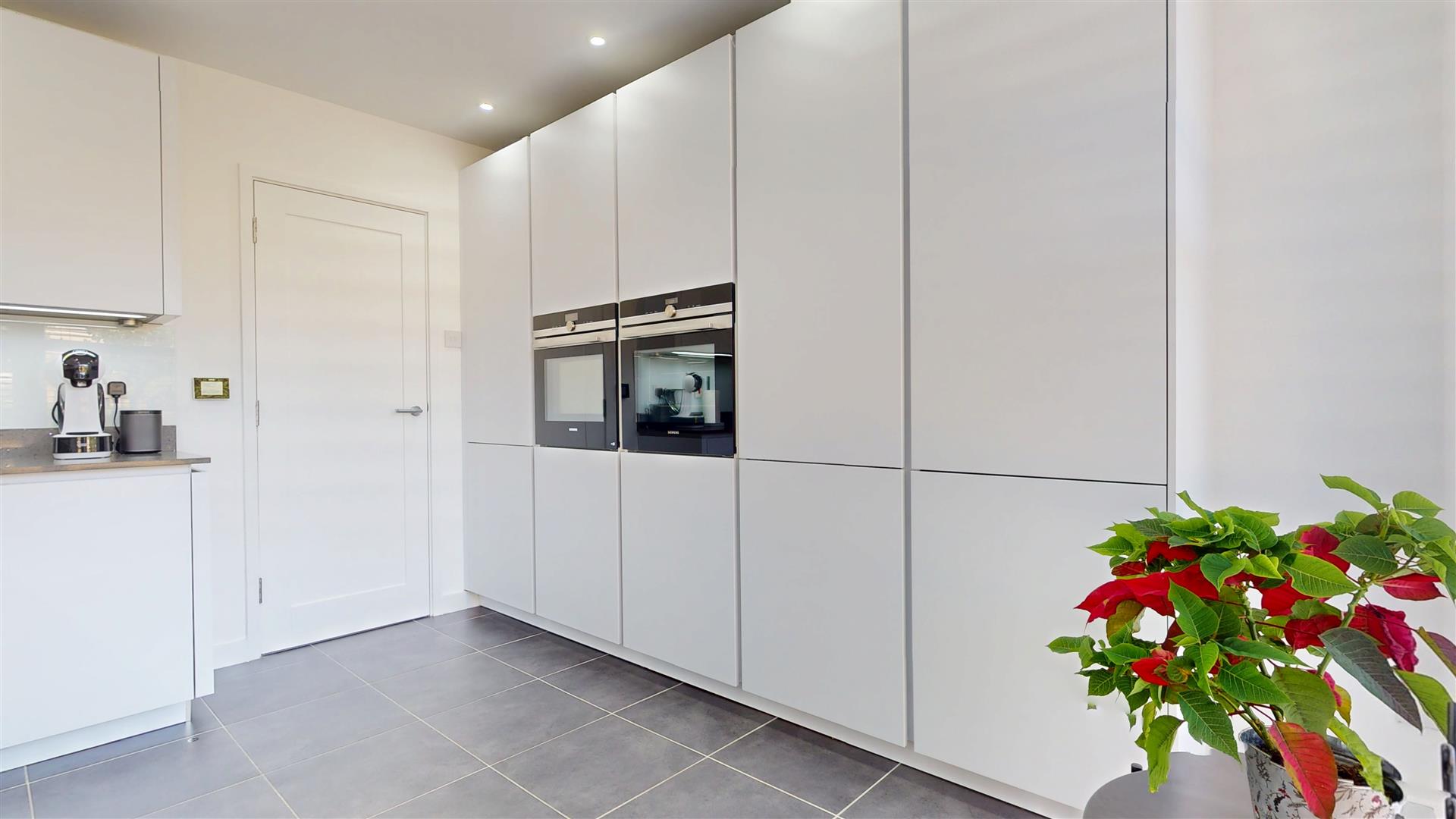 Double glazed window to side with fitted blinds. Fitted with a modern range of wall and base units with Quartz worksurfaces incorporating stainless steel sink drainer and quooker mixer tap and water softener. Two electric ovens, one with microwave function. induction hob and extractor hood. Integral fridge and freezer. Plumbing for dishwasher. Fitted wine and drinks cooler. LED lighting Under cupboard lighting. Tiled flooring with under floor heating.