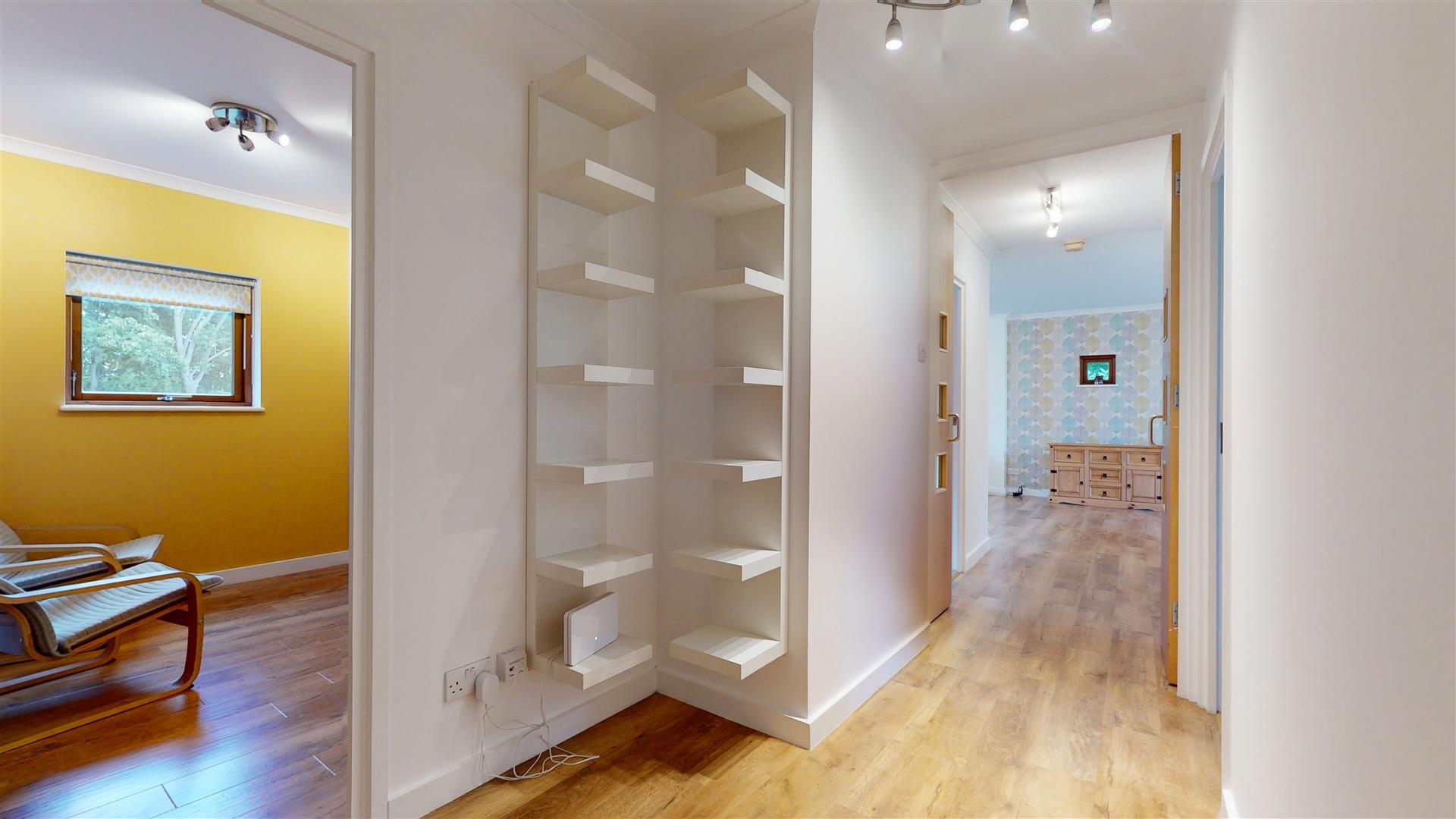 Entrance door. Doors to all rooms. Double door coat and storage cupboard. Hanging shelves. Coving to skimmed ceiling. Wall mounted heater. Karndean flooring. Video entry phone. Internal French doors leading to kitchen/lounge area. Security system.