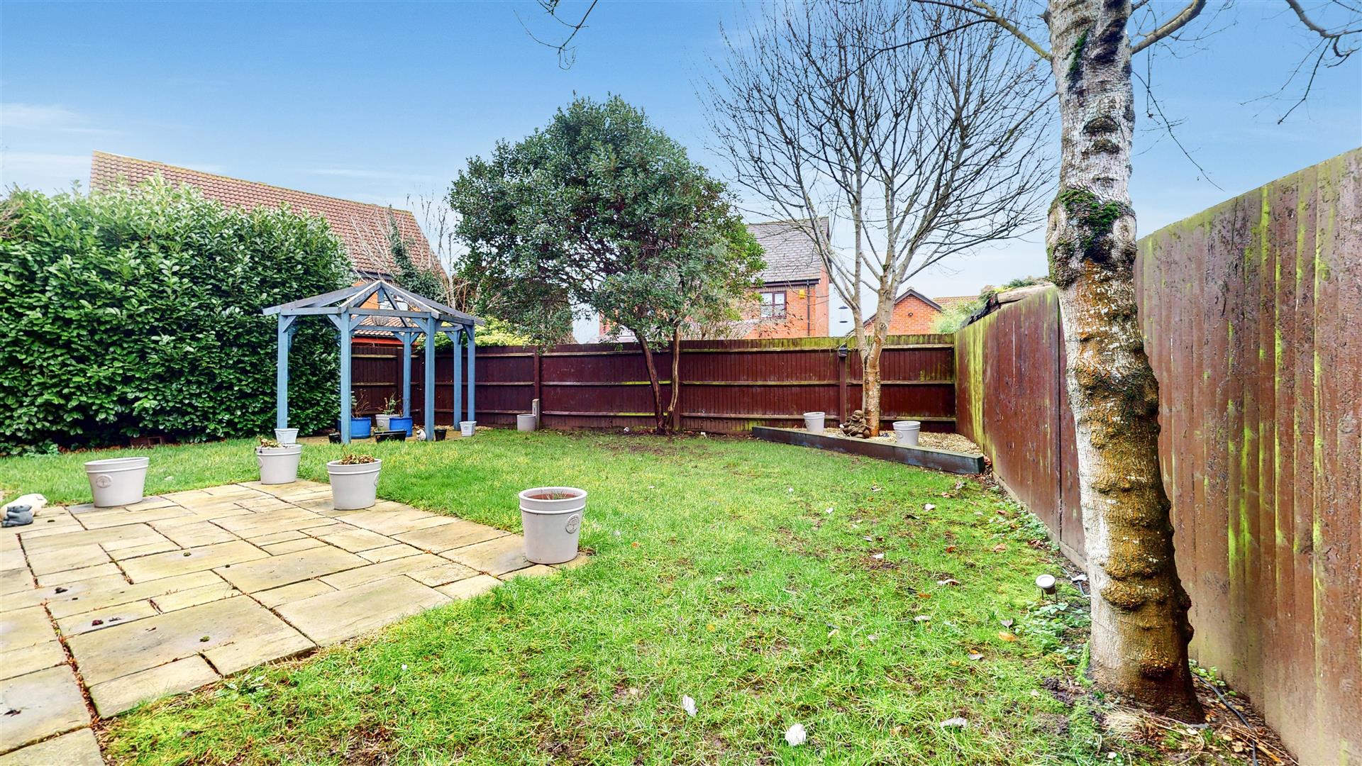 Mainly laid to lawn with rear width patio area and pergola with mature trees and borders. Trees and foliage to side with hedge borders. Gated access to front. Outside tap and power.