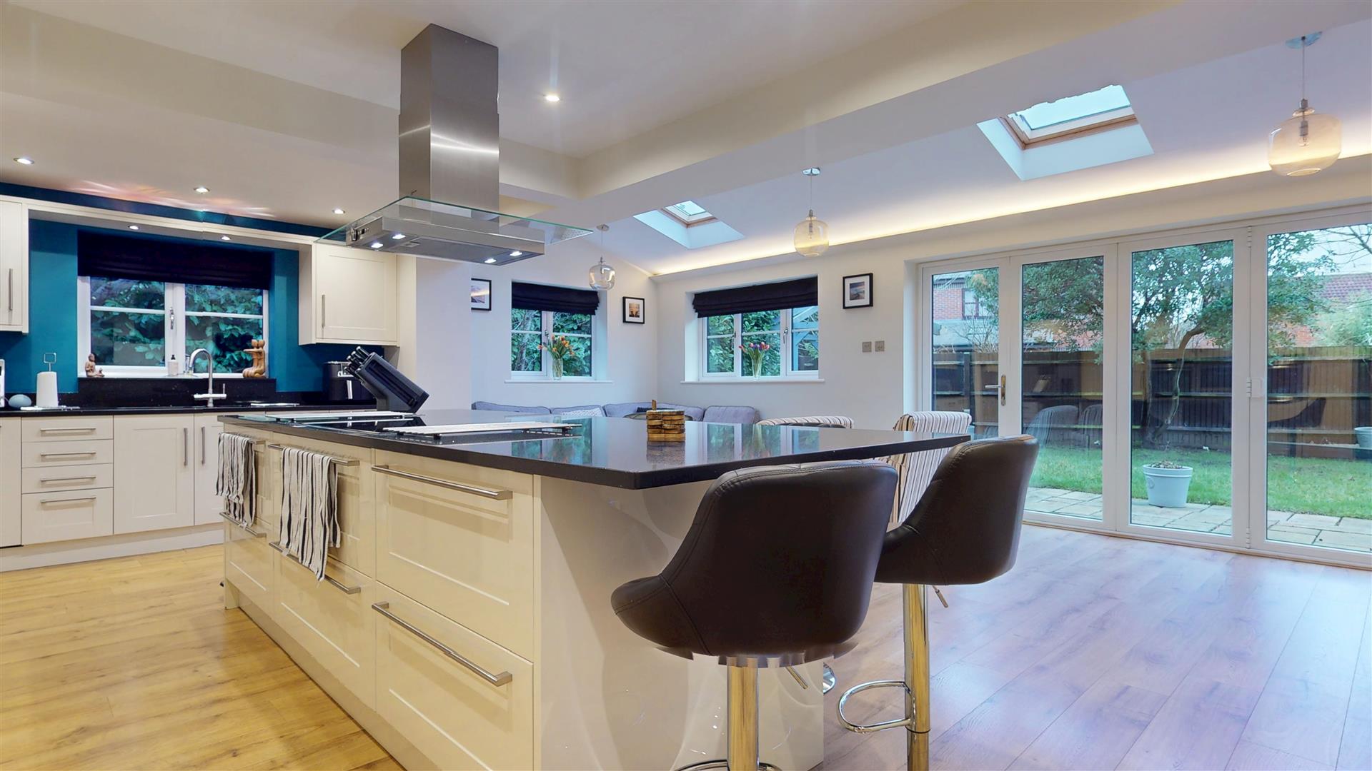 Double glazed windows to side and rear. Sky lights to rear. Double glazed bi folds to rear. A vast selection of wall and base units with Granite worksurfaces and central island with base units., breakfast bar, Neff induction hob with extractor. Two Neff electric ovens, warming drawer and steam oven. One and half bowl sink with engraved drainer and boiling water tap. Integral dishwasher. Inset lightin.; LED lighting. Space for American style fridge freezer. Wine cooler. Part vaulted ceiling. Under floor heating. French doors to dining room and utility room.