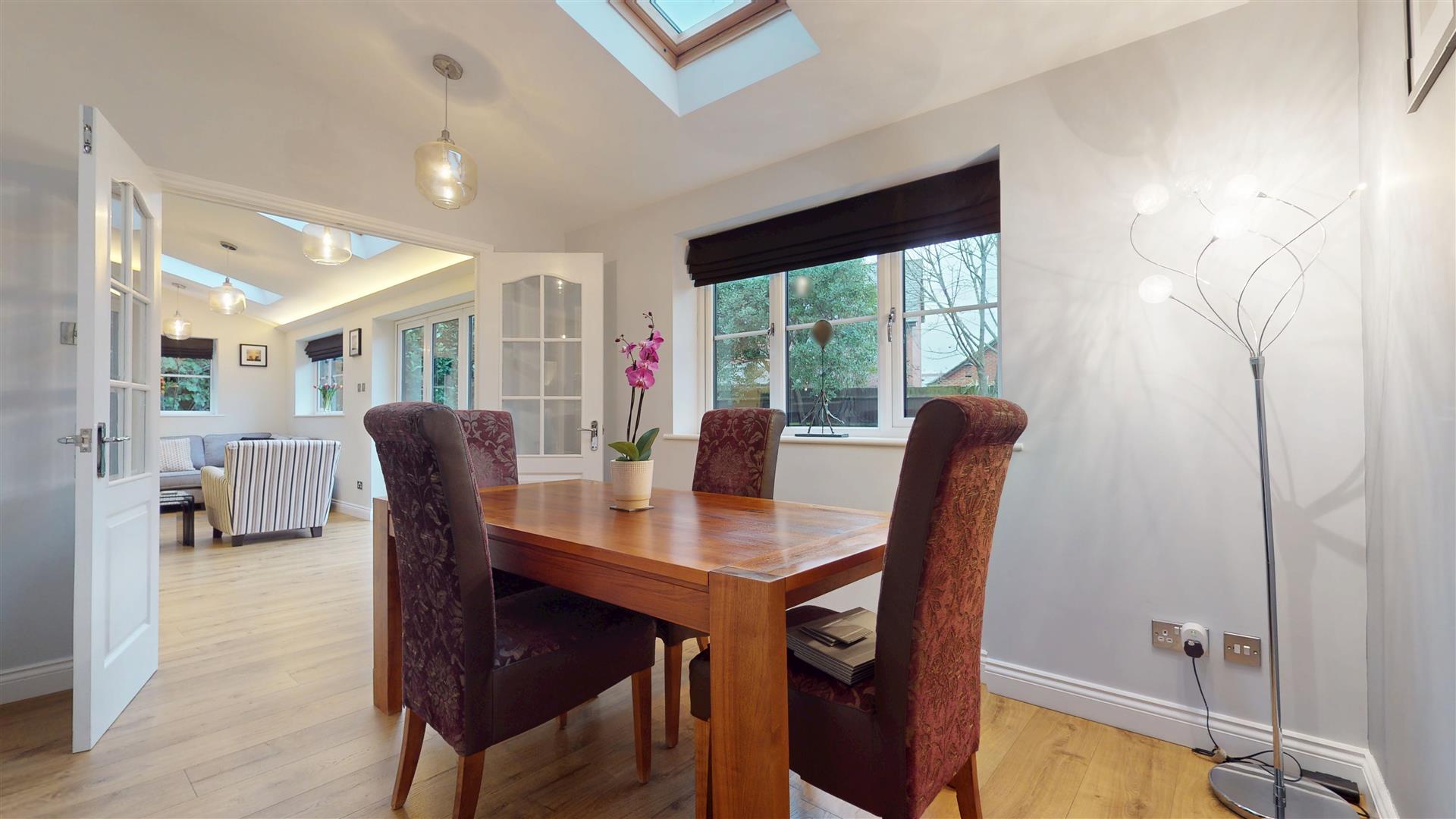Double glazed window and double glazed sky light to rear. French doors to living room and kitchen/dining/family room. Under floor heating.