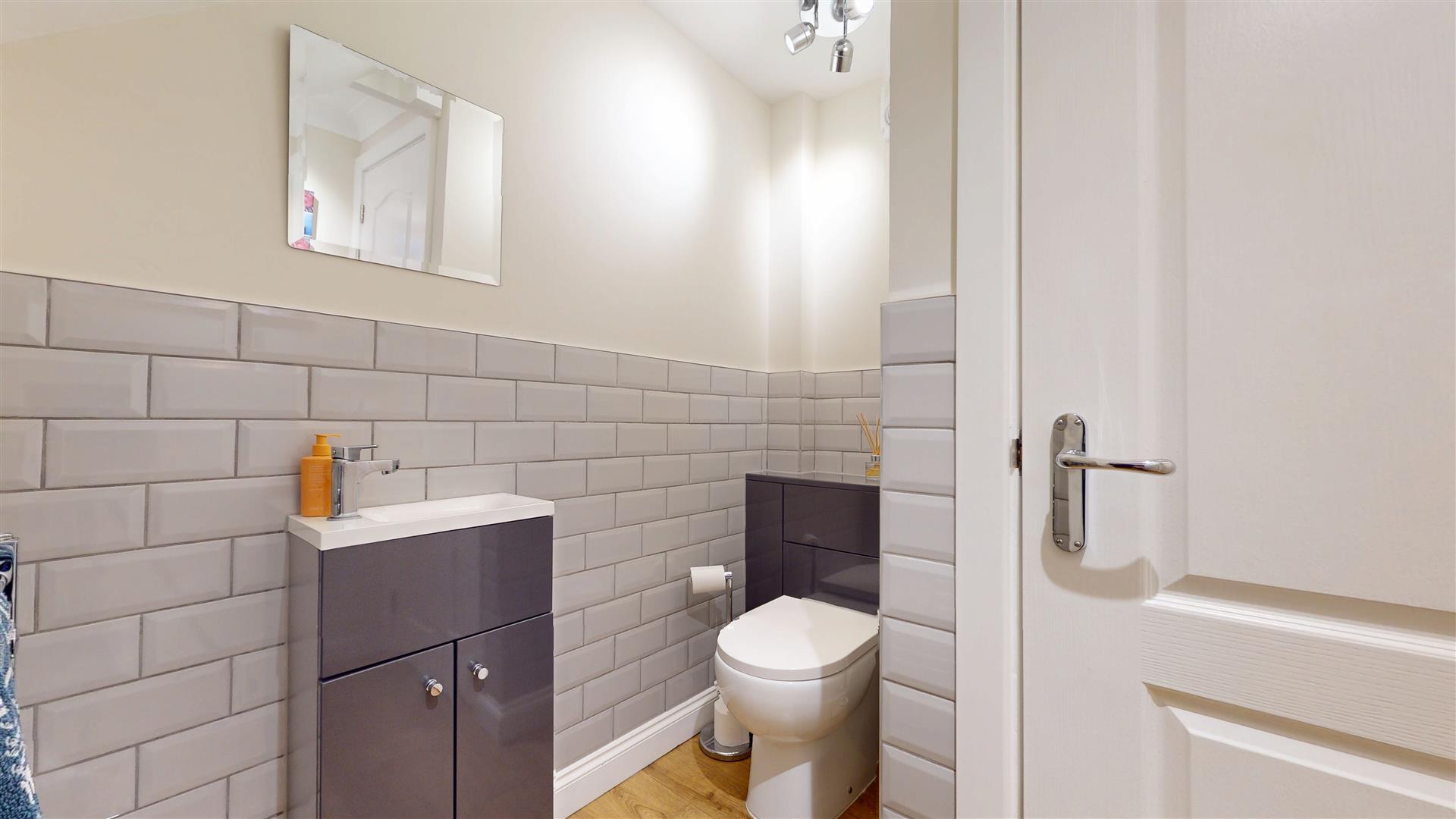 Two piece suite comprising close coupled wc and wash hand basin in vanity surround. Heated towel rail. Extractor fan. Part tiled walls. Coat and shoe storage.