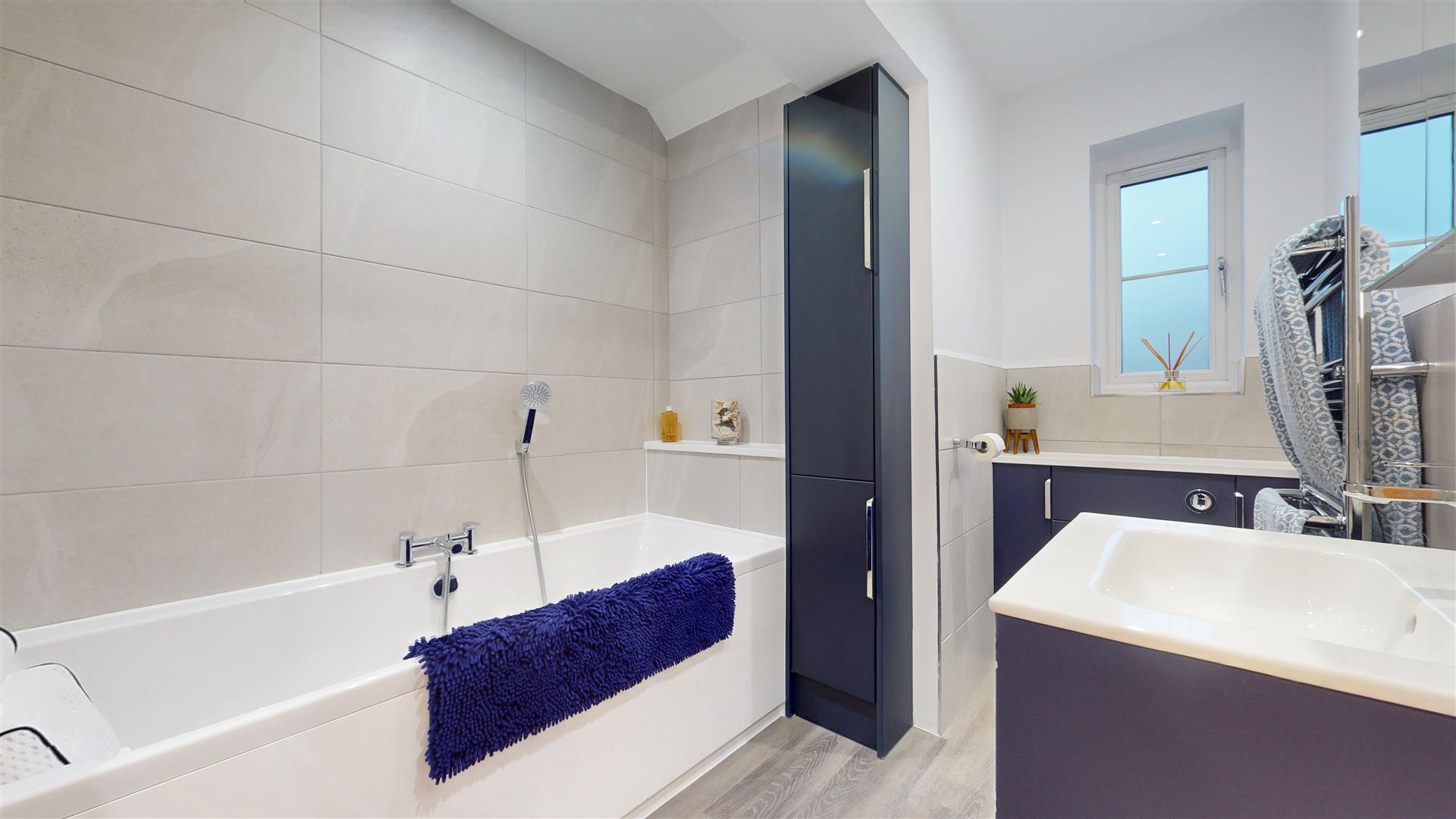 Double glazed obscure window to side. Four piece suite comprising bath with shower attachment, shower cubicle with shelving, wash hand basin in vanity surround and close coupled wc. Wall mounted cupboard and lit mirror. Heated towel rail. Tiled walls. LED lighting. Extractor fan.