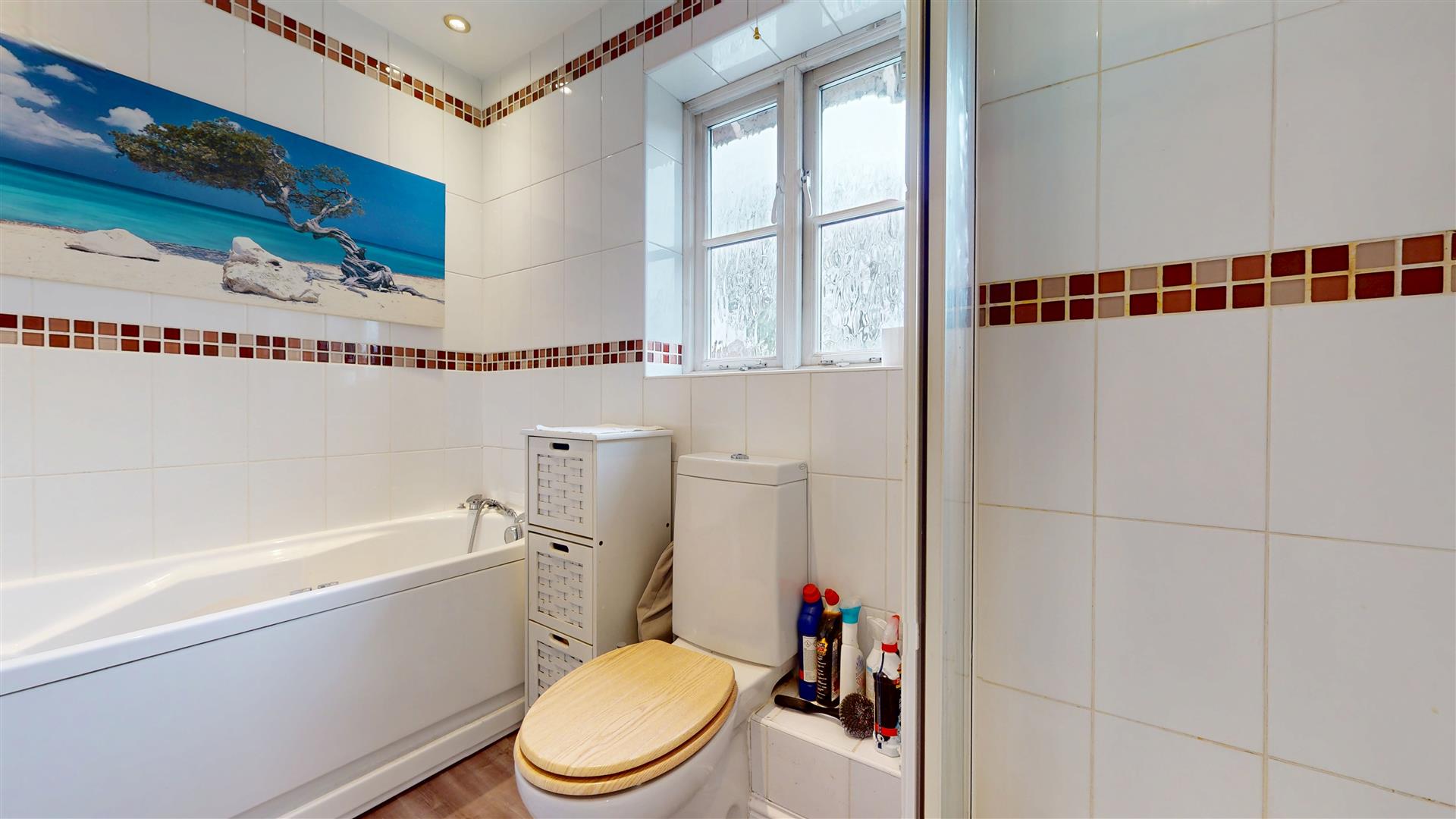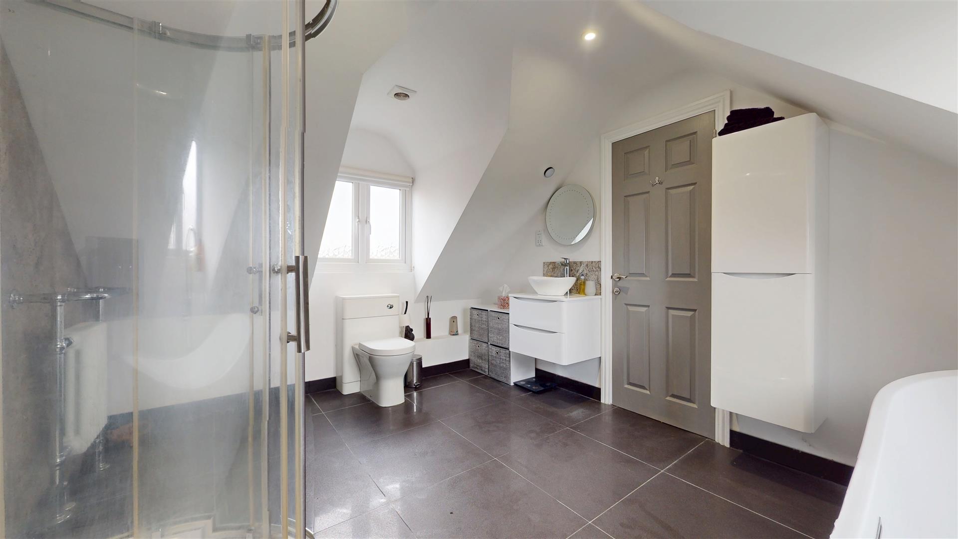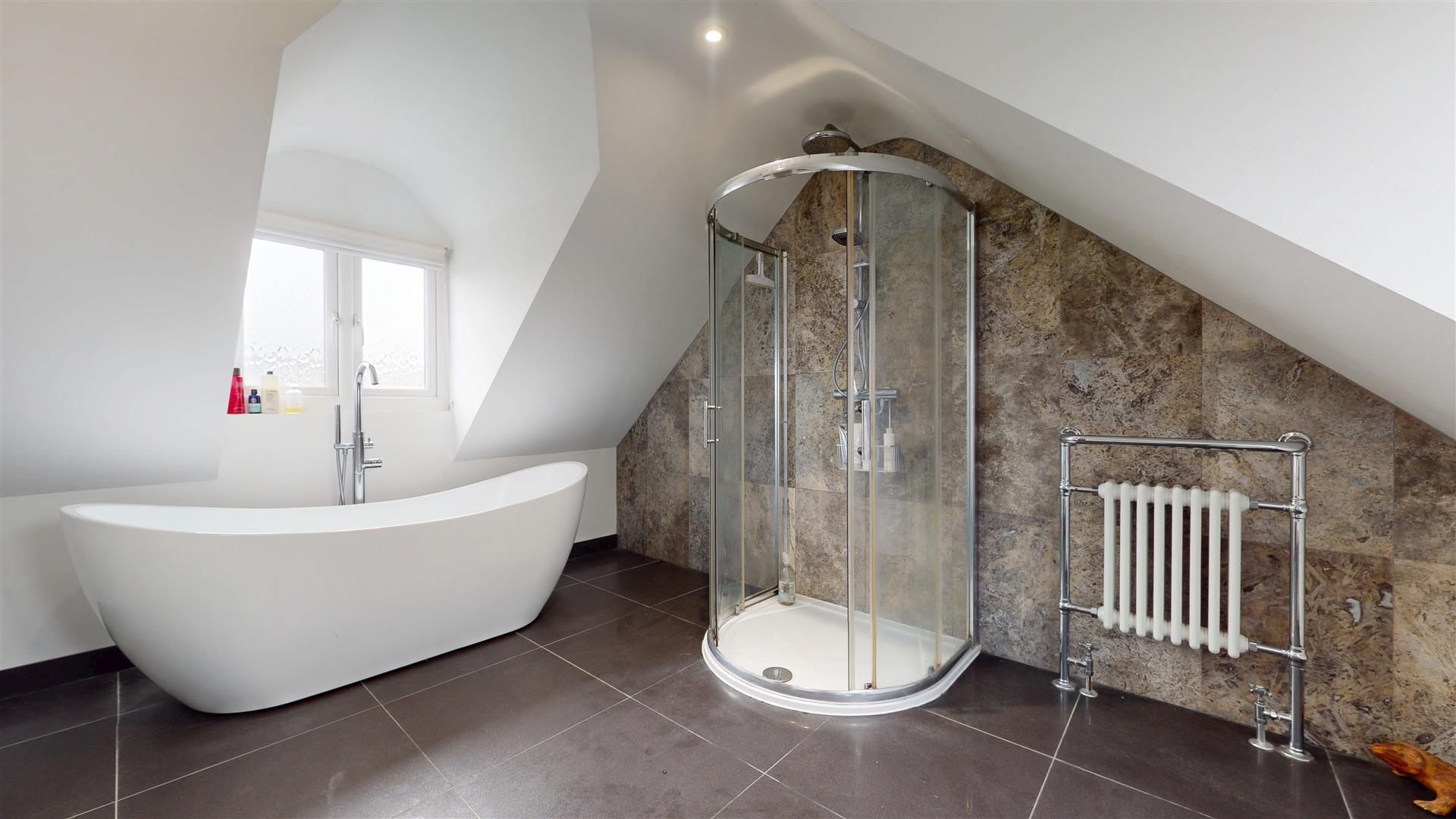 Double glazed obscure windows to front and rear. Freestanding bath with hand shower attachment, shower cubicle with mains shower, wash hand basin in vanity surround and close coupled wc. Heated towel rail. Shaver point. Lit mirror. Extractor fan. LED lighting. Tiled flooring. Tiled walls.