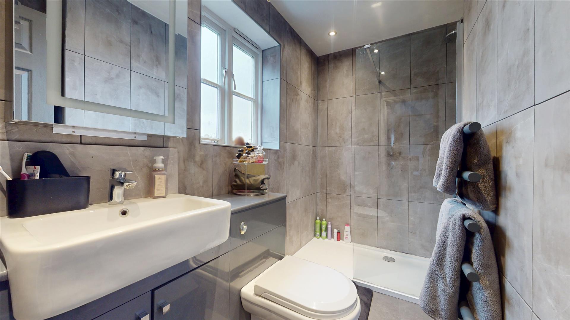 Double glazed window to front. Re-fitted suite comprising walk in shower cubicle with glass panel and mains shower, wash hand basin in vanity surround and close coupled wc. Lit mirror. Heated towel rail. Extractor fan. Tiled walls.