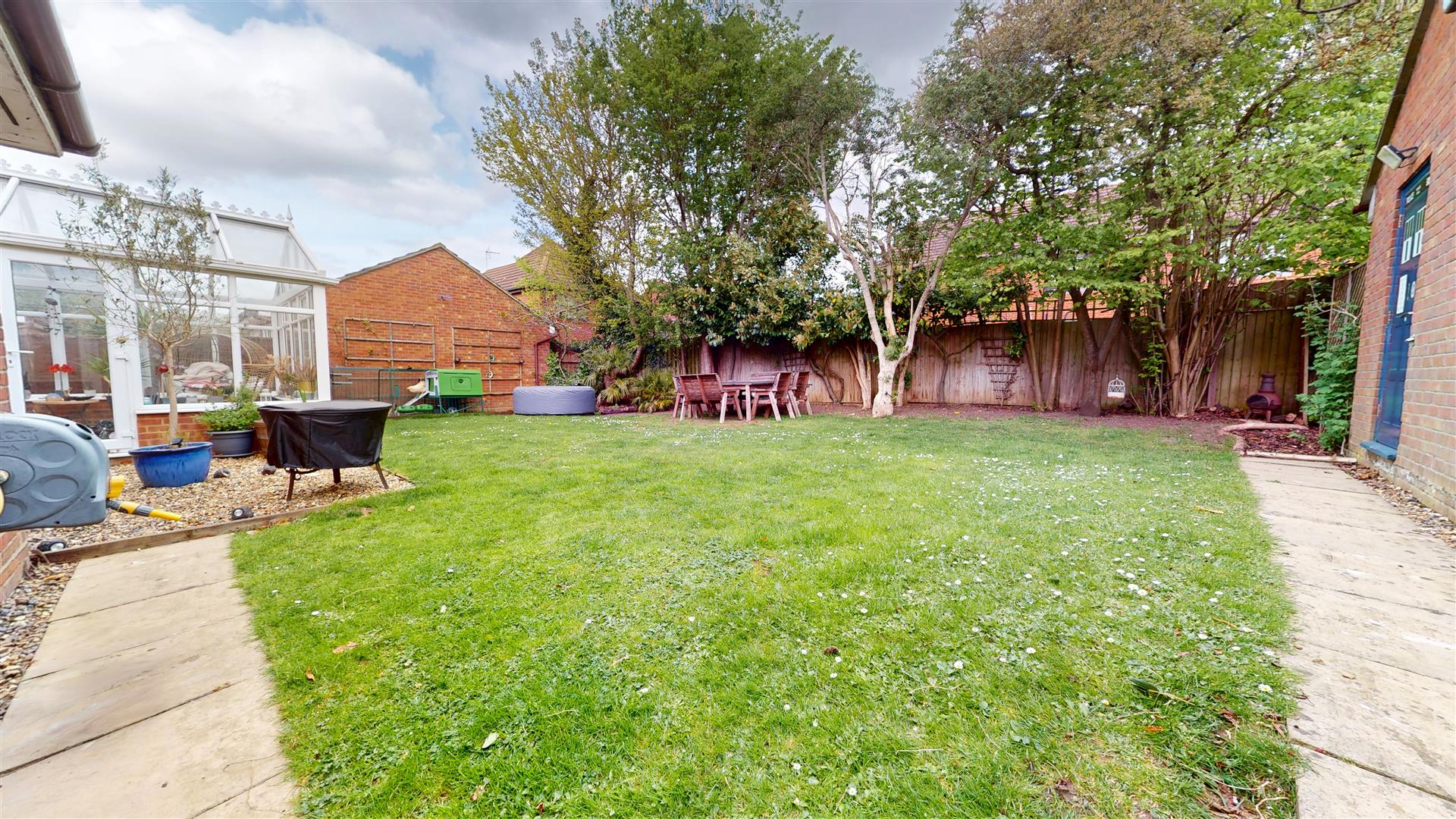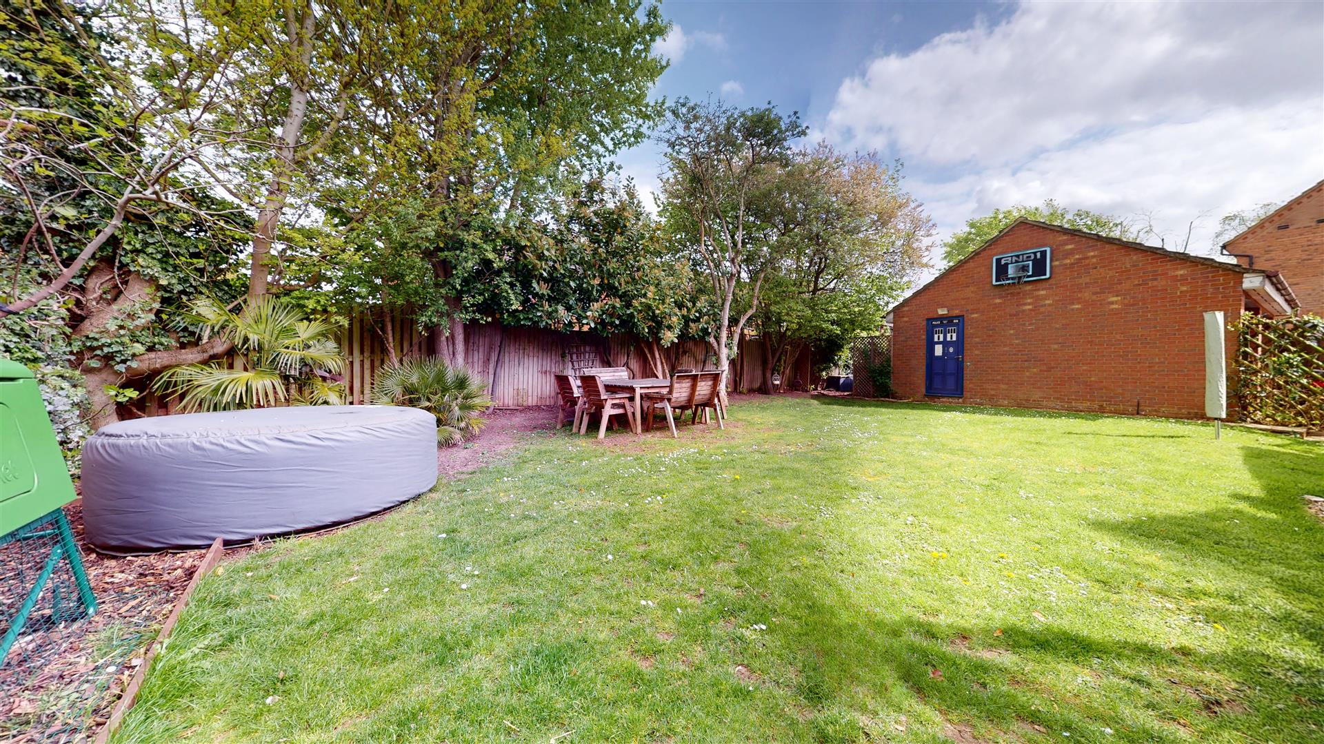 Laid to lawn with rear shingle seating area, mature flower beds and borders, trees, plants and foliage. Timber garden shed. Gated access to side. Personal door to garage. Outside tap and power.