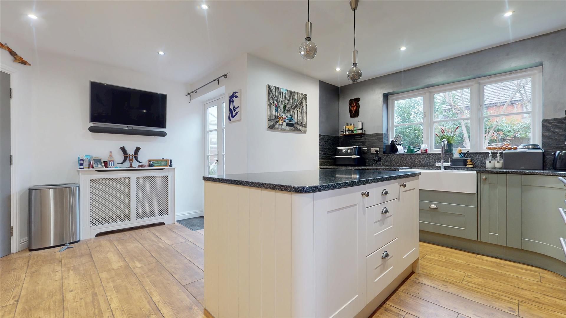Double glazed window to rear. Double glazed French doors to rear. Double glazed door to side. Re-fitted range of wall and base units with Quartz worksurfaces. Central island with breakfast bar, base units and Quartz worksurface. Double sink unit and drainer with boiling water tap and waste disposal. Rangemaster oven with gas hob and extractor hood over. Space for American style fridge freezer. Integral dishwasher. LED lighting. Tiled flooring. Radiator.