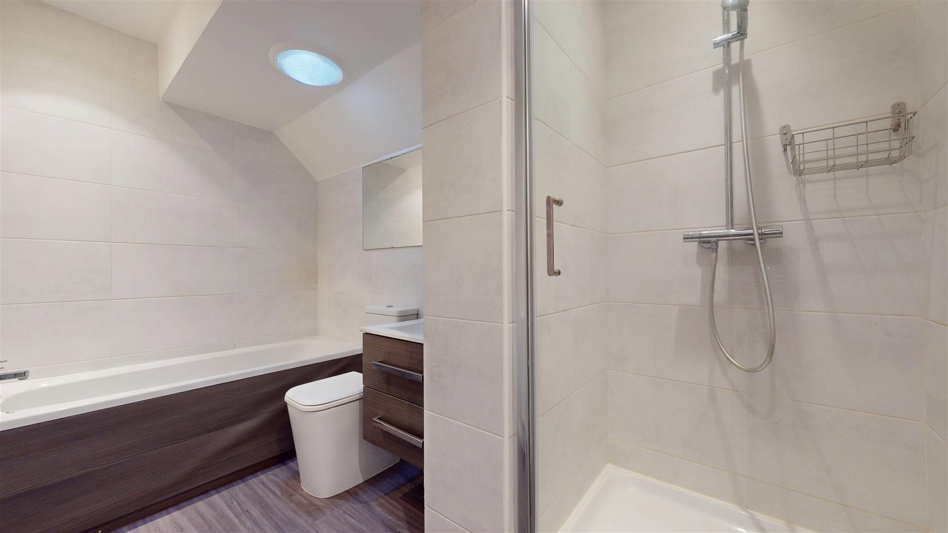 Three piece suite comprising bath with mixer tap, shower cubicle with mains shower. wash hand basin with vanity surround and close coupled wc. LED lighting. Shaver point. Extractor fan. Radiator. Light tube.