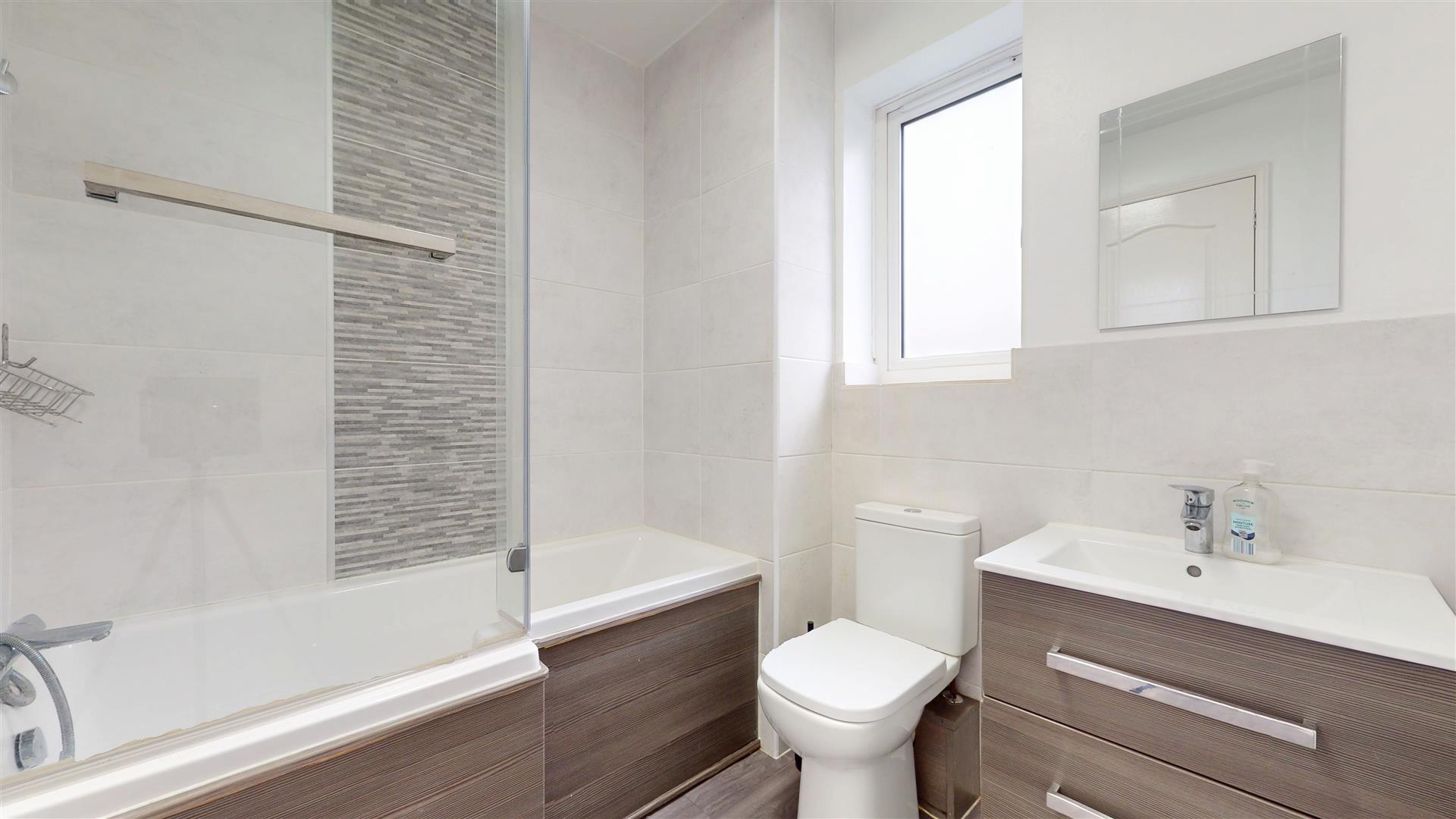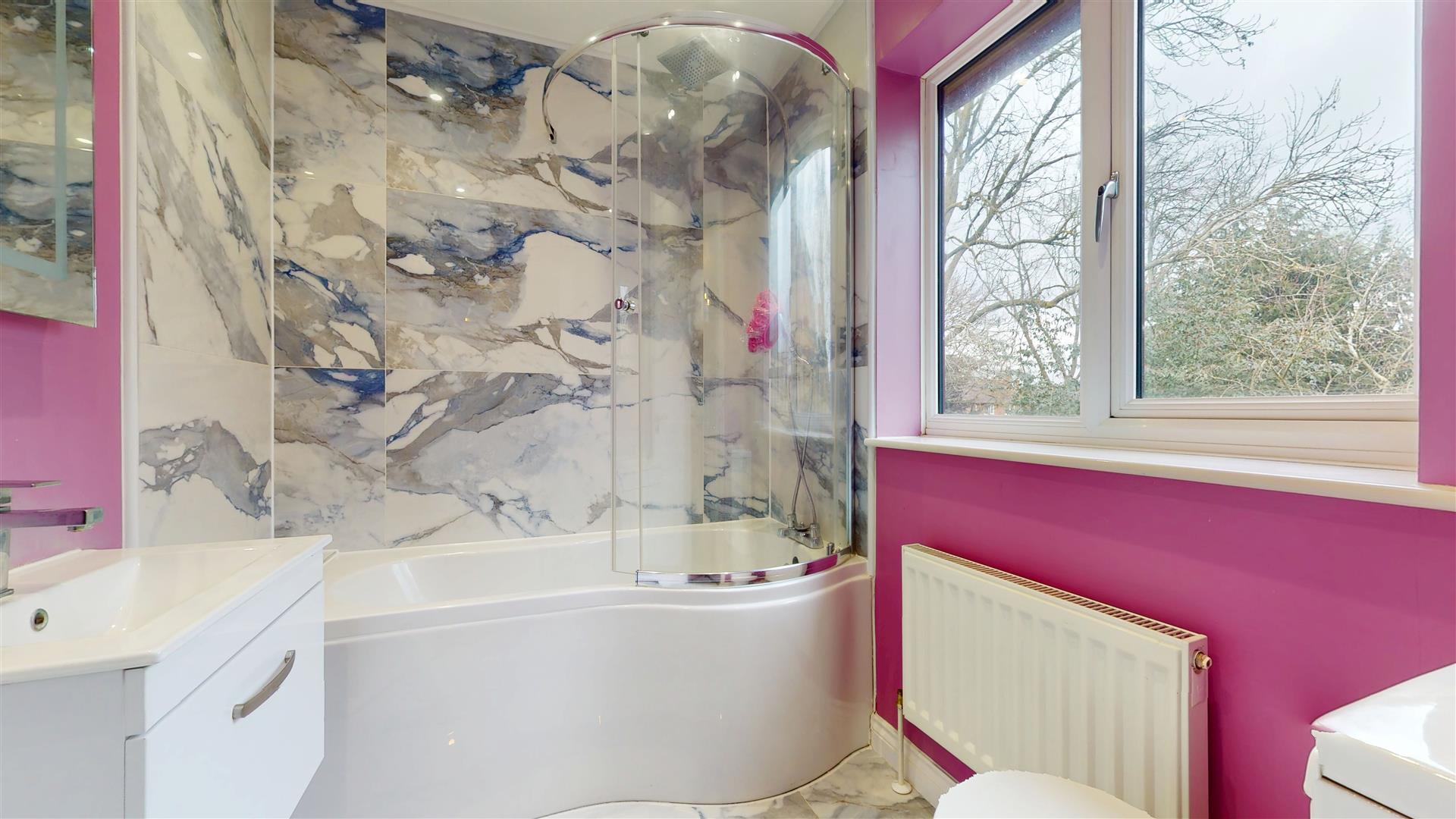 Double glazed obscure window to rear. Three piece suite comprising bath with shower over and screen, wash hand basin in vanity surround and close coupled wc. Radiator. Shaver point. Extractor fan.