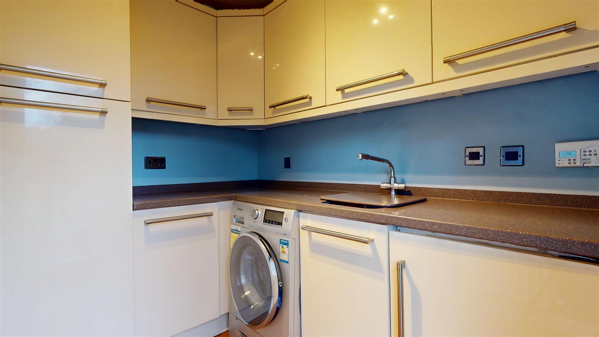 Double glazed windows to rear and side. Fitted range of wall and base units with Corian worksurfaces. One and half bowl sink drainer and mixer tap. Electric oven and hob with extractor hood over. Integral fridge freezer and dishwasher. Under cupboard lighting. Vertical radiator. Door to utility room.