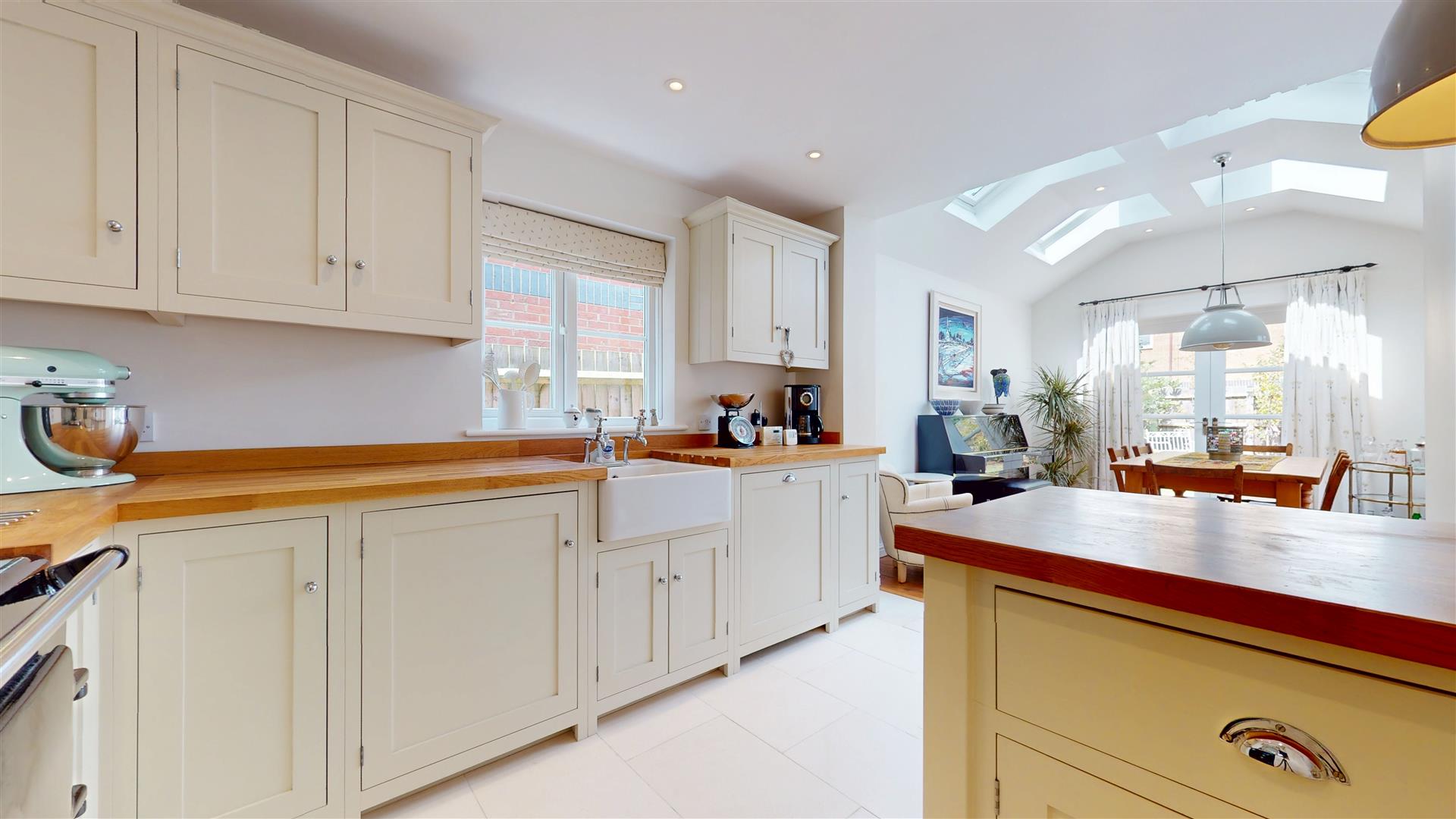 Fitted with a range of wall and base units with worksurfaces incorporating sink drainer unit and Butler style sink. Aga. Built in dishwasher and fridge freezer. Central island unit. Skimmed ceiling. Inset lighting. Splash back tiling. Double glazed window to side. Opening to extended family room. Door to utility room. Double glazed French doors to rear. Two radiators.