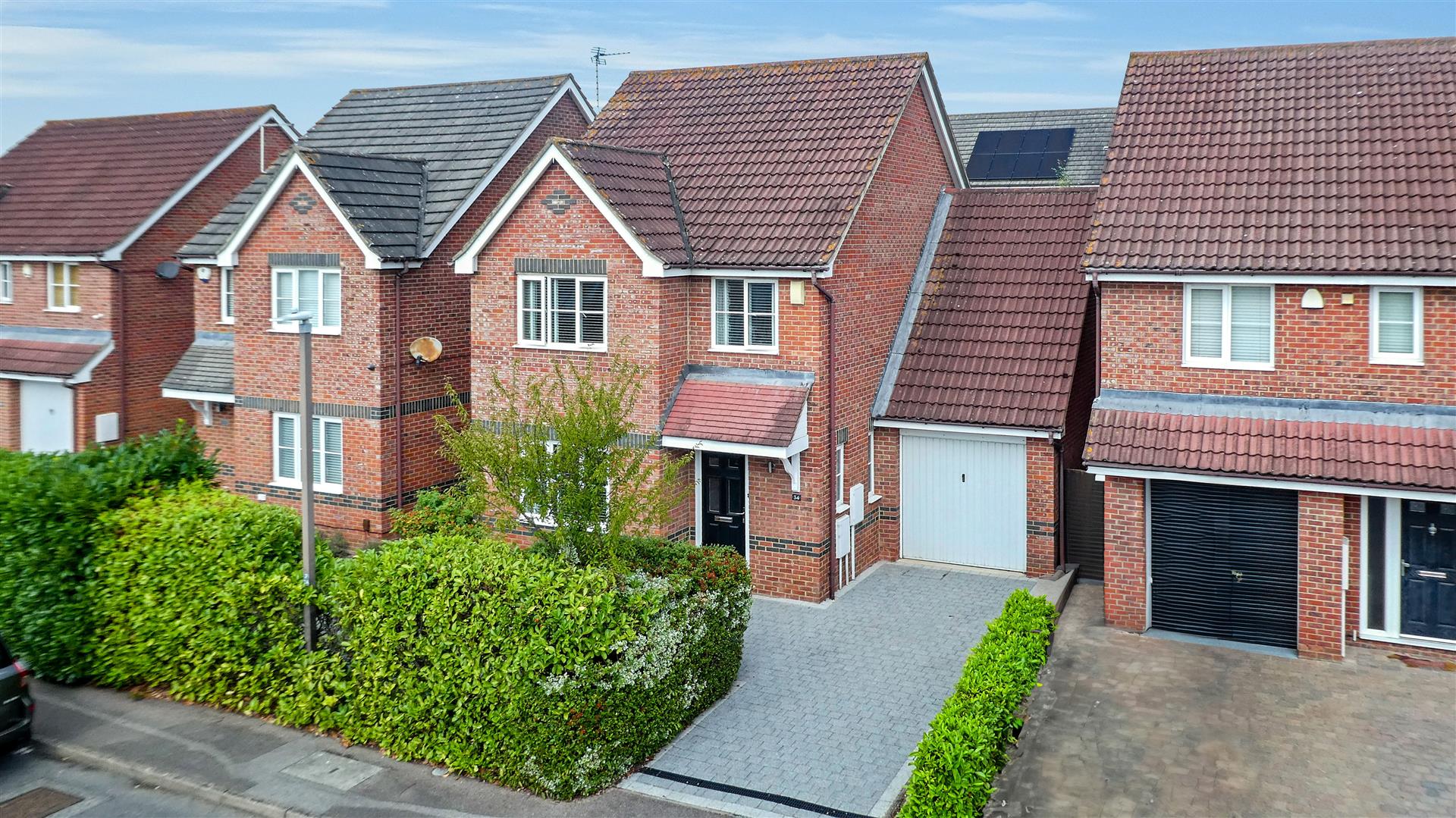 Block paved driveway leading to single garage. Hedgerow surround. Storm porch.