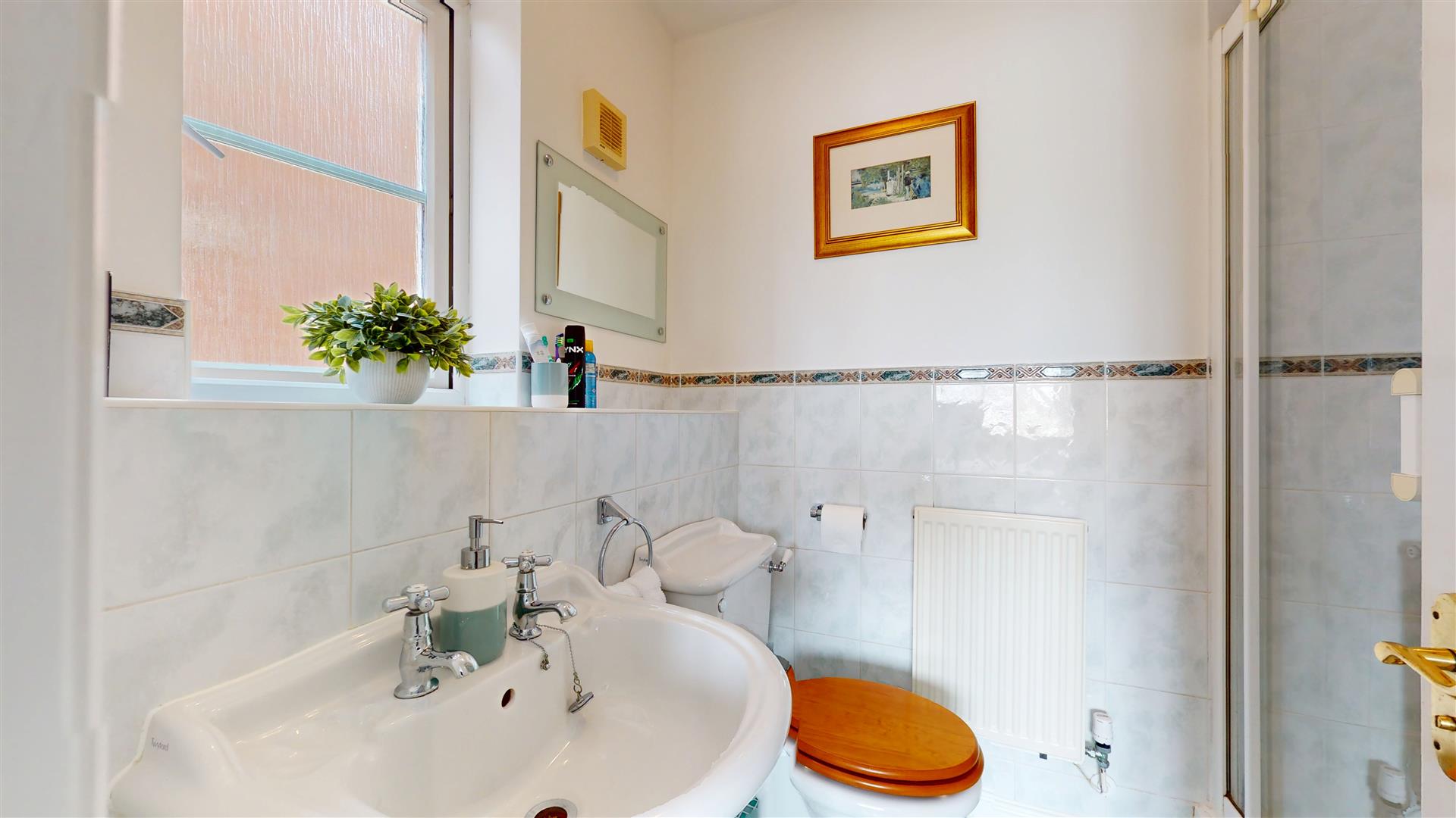 Three piece suite comprising tiled shower cubicle with wall mounted shower, low level wc and wash hand basin. Part tiled walls. Frosted double glazed window to side. Extractor fan. Radiator.