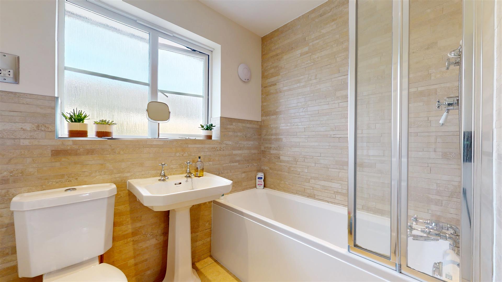 Re-fitted suite comprising panelled bath with shower over, low level wc and wash hand basin. Part tiled walls. Towel radiator. Skimmed ceiling with inset lighting. Shaver point. Extractor. Frosted double glazed window to rear.