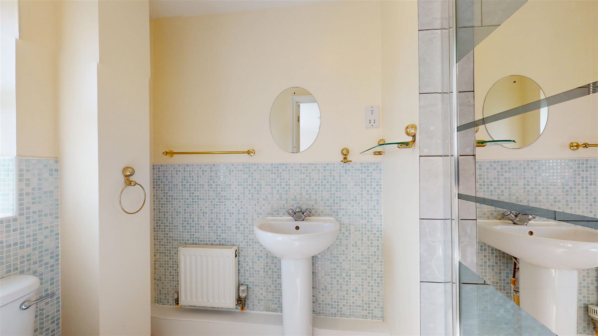 Four piece suite. Panelled bath with mixer tap. Low level wc. Wash hand basin with mixer tap. Tiled shower cubicle with wall mounted shower. Shaver point. Extractor. Frosted double glazed window to the rear. Radiator. Skimmed ceiling.