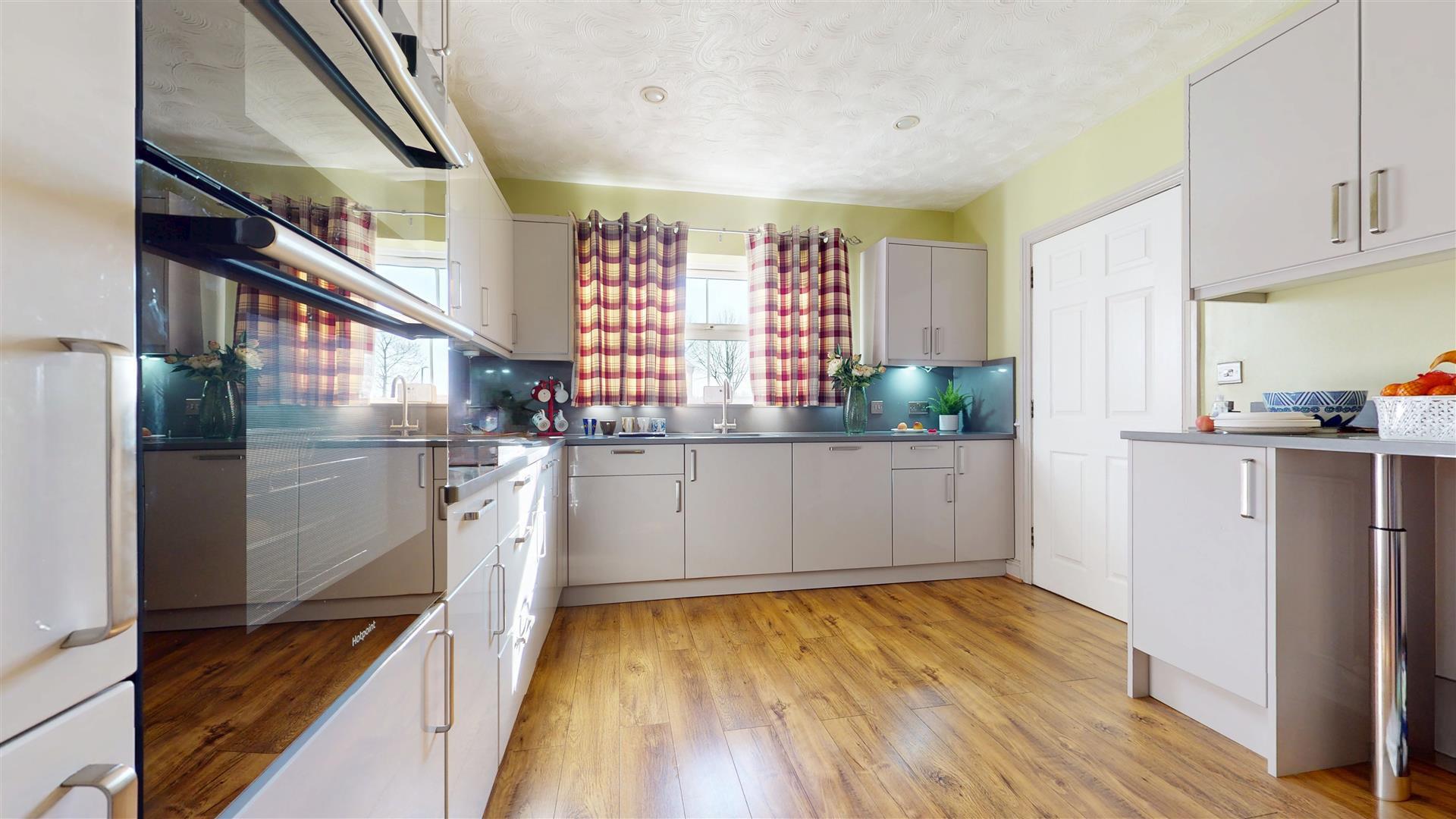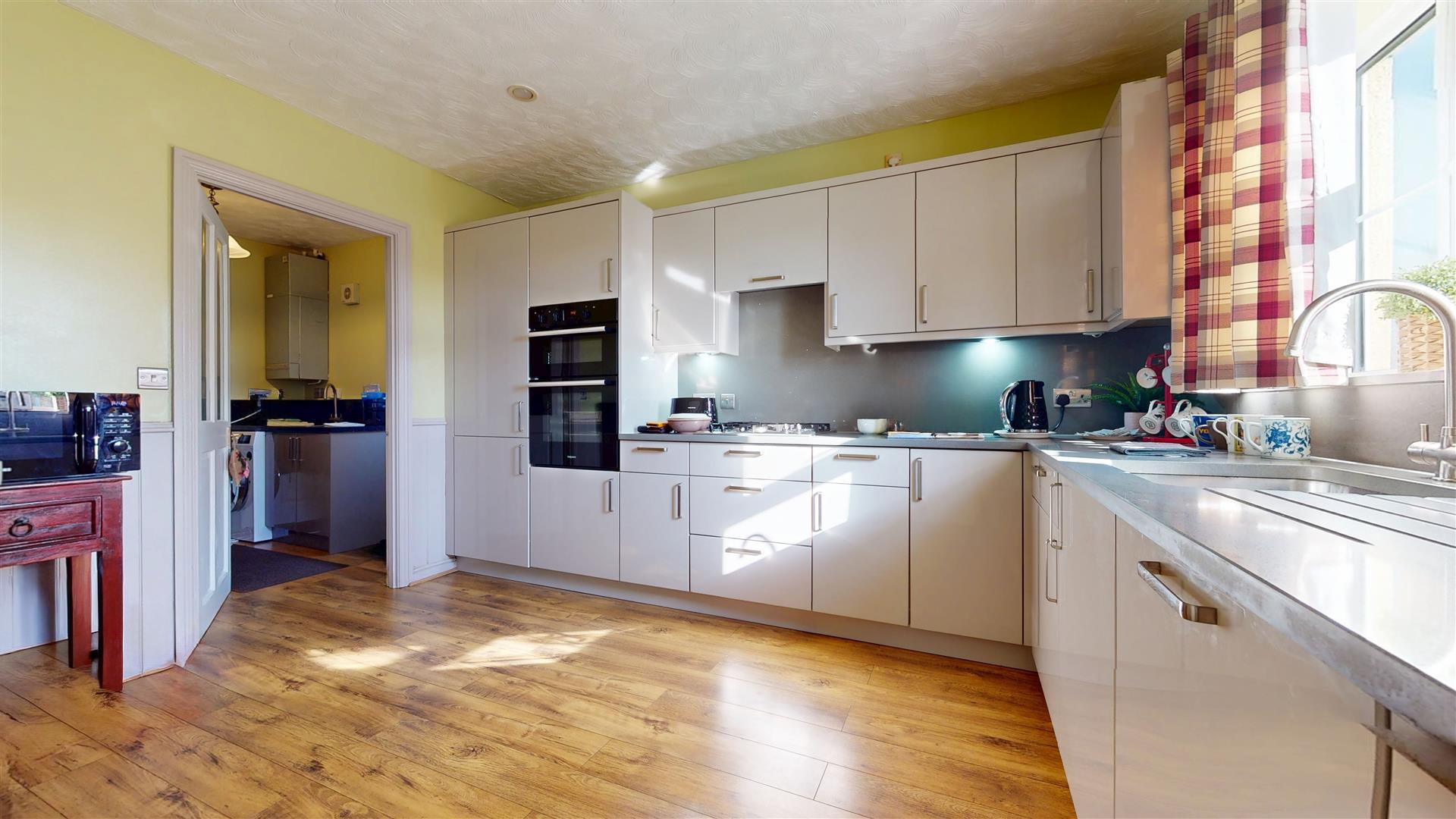 Double glazed window to front aspect. Fitted with a range of wall and base units with worksurfaces incorporating sink with mixer tap and drainer. Stainless steel effect oven and hob with extractor fan. Integrated fridge freezer. Integrated dishwasher. Tiled flooring. Inset spot lights. Radiator. Door to utility room.