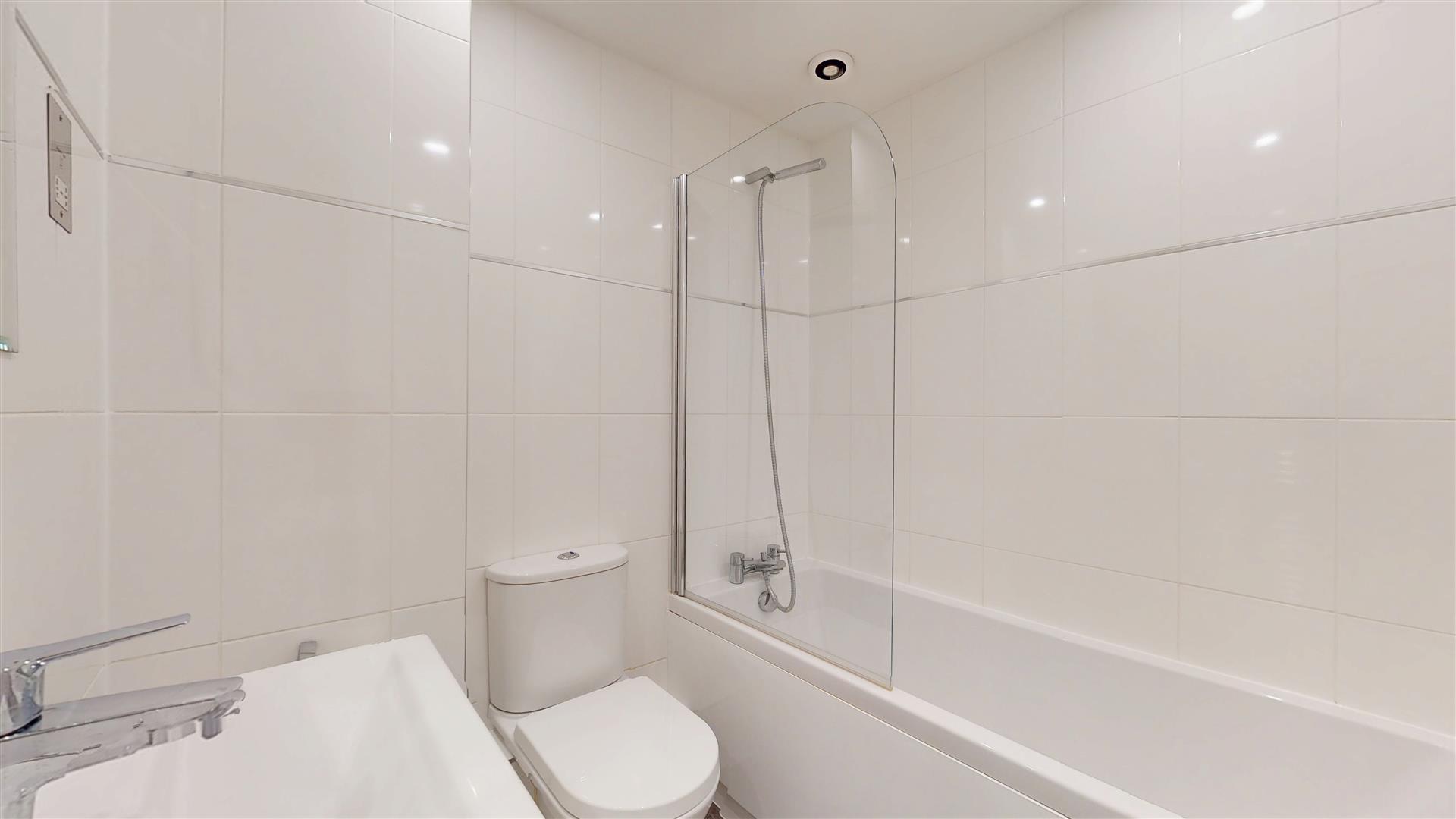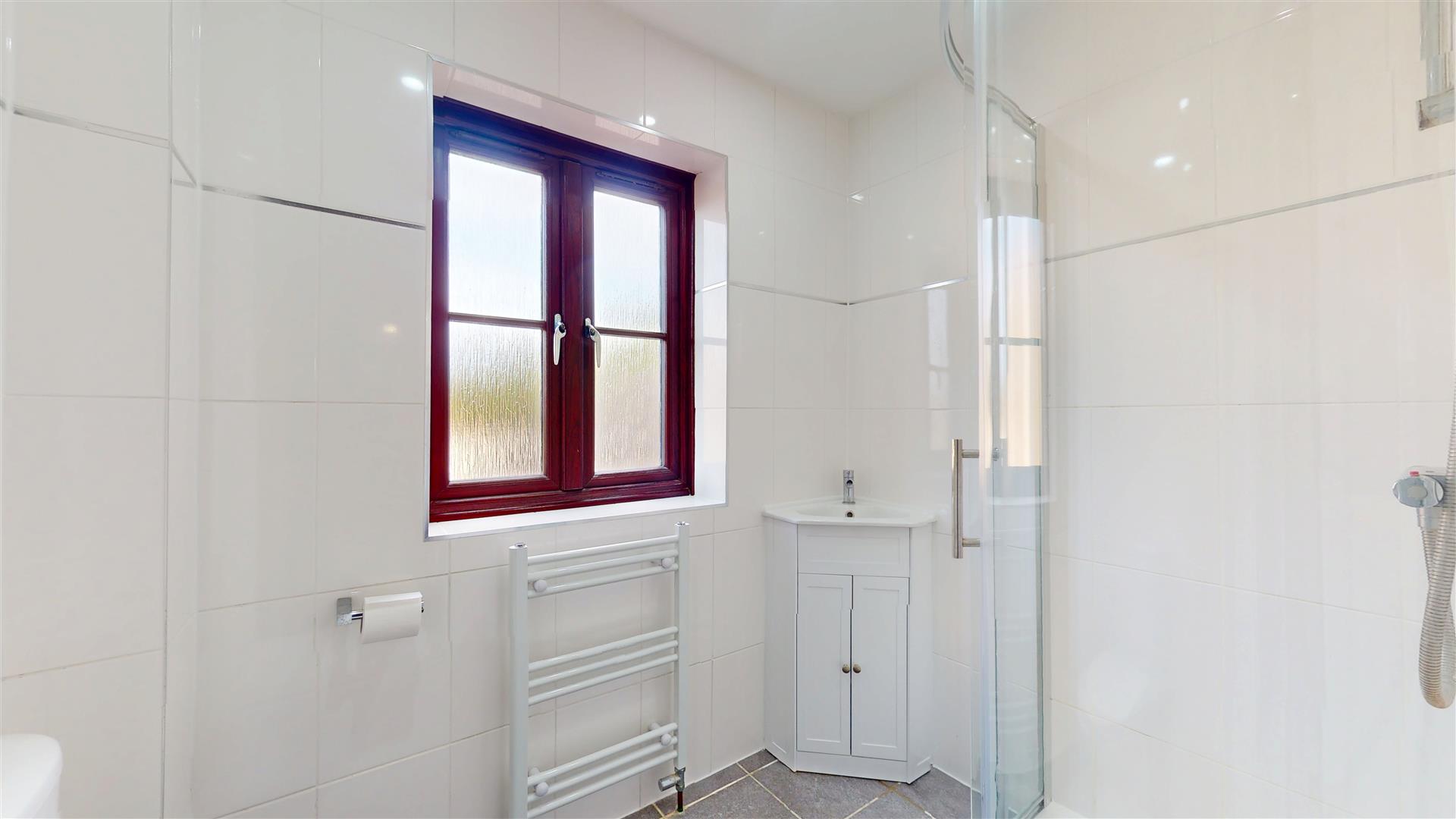 Re-fitted three piece suite comprising tiled shower cubicle with shower, low level wc and wash hand basin with vanity surround and close coupled wc. Heated towel rail. Tiled walls and flooring. Skimmed ceiling with inset lighting. Extractor. Frosted double glazed window to front.