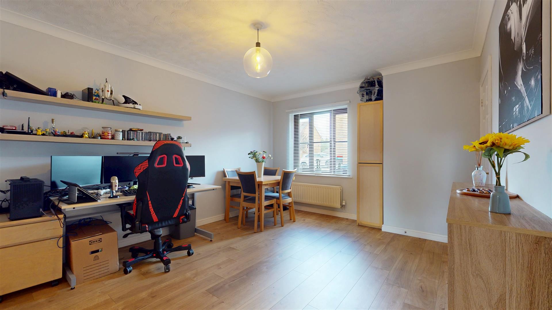 Dual aspect room with double glazed window to side. Double glazed door to rear. Feature Media wall. Skimmed ceiling with inset lighting.